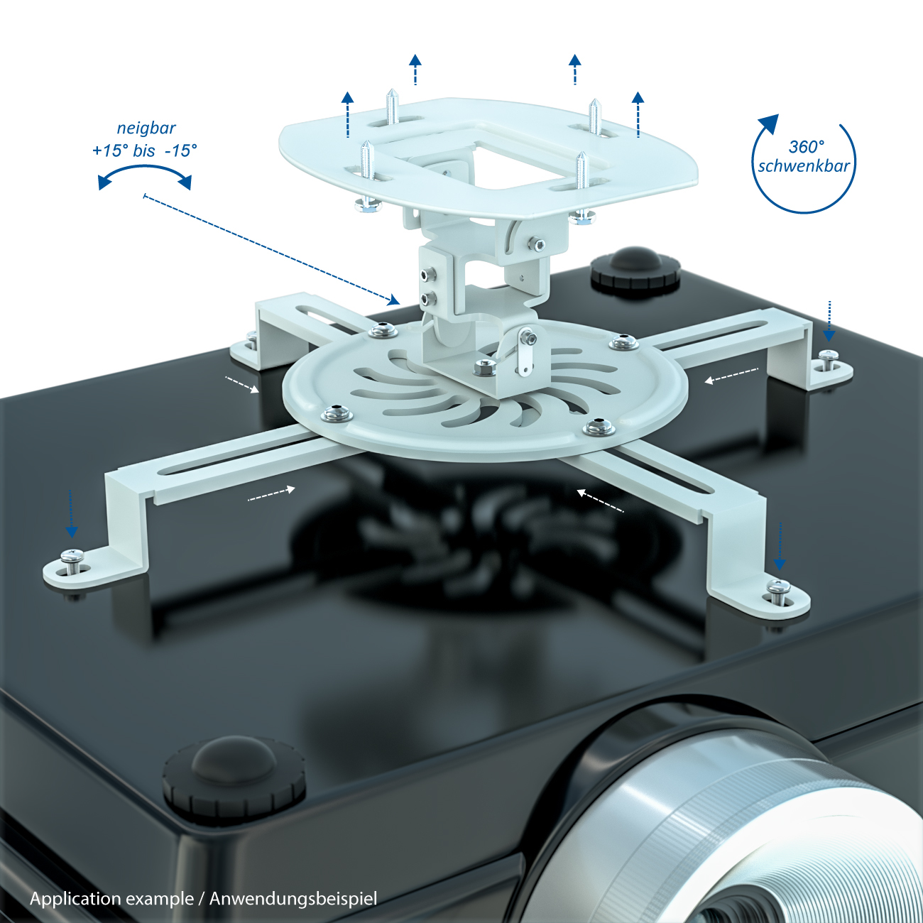 Dank einem variabel einstellbaren Neigungswinkel von -15° / +15° und der Möglichkeit den Beamer oder Projektor 360° zu schwenken,
