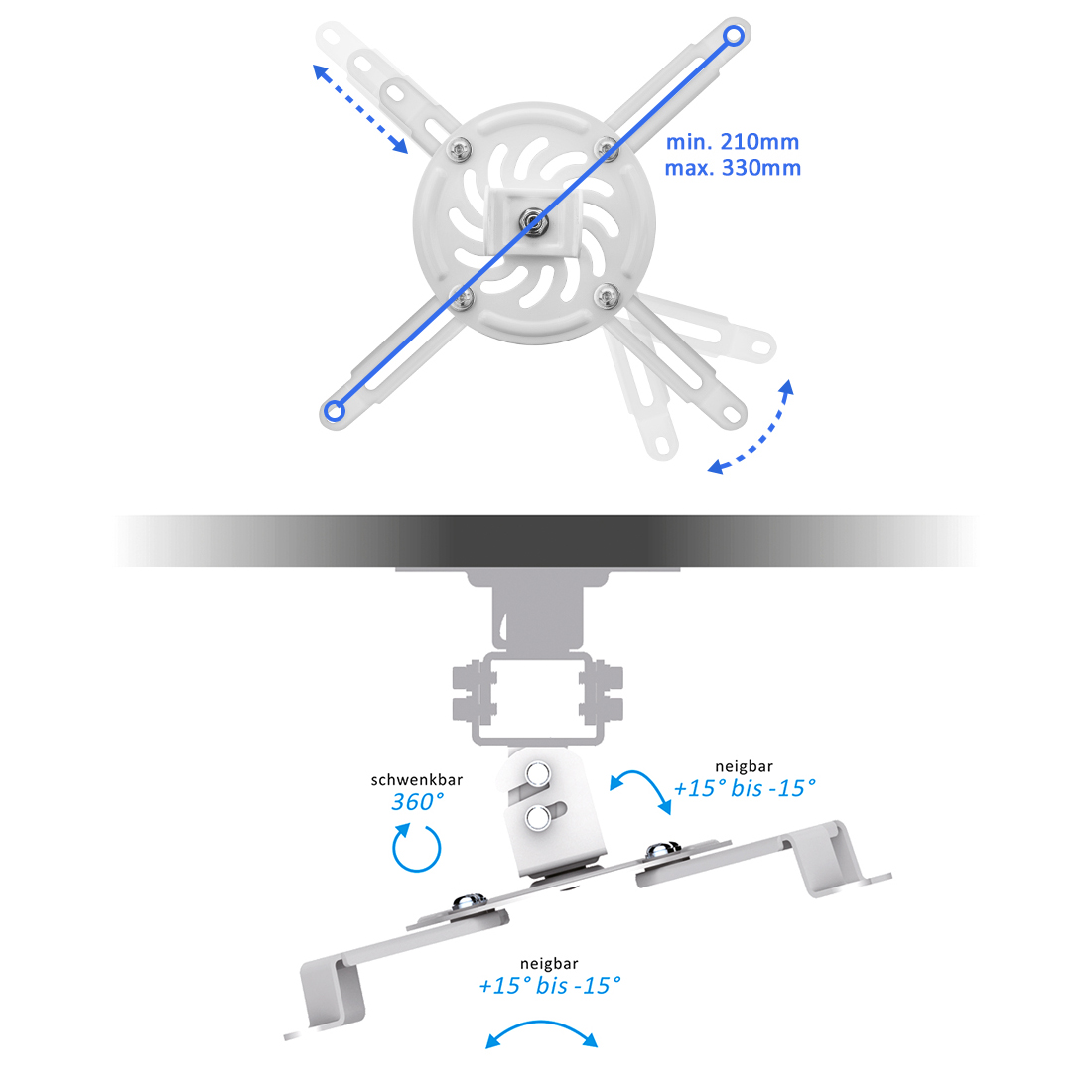 Die Lochabstände zur Beamer oder Projektor Befestigung können individuell eingestellt werden (min. 210mm, max. 330mm).