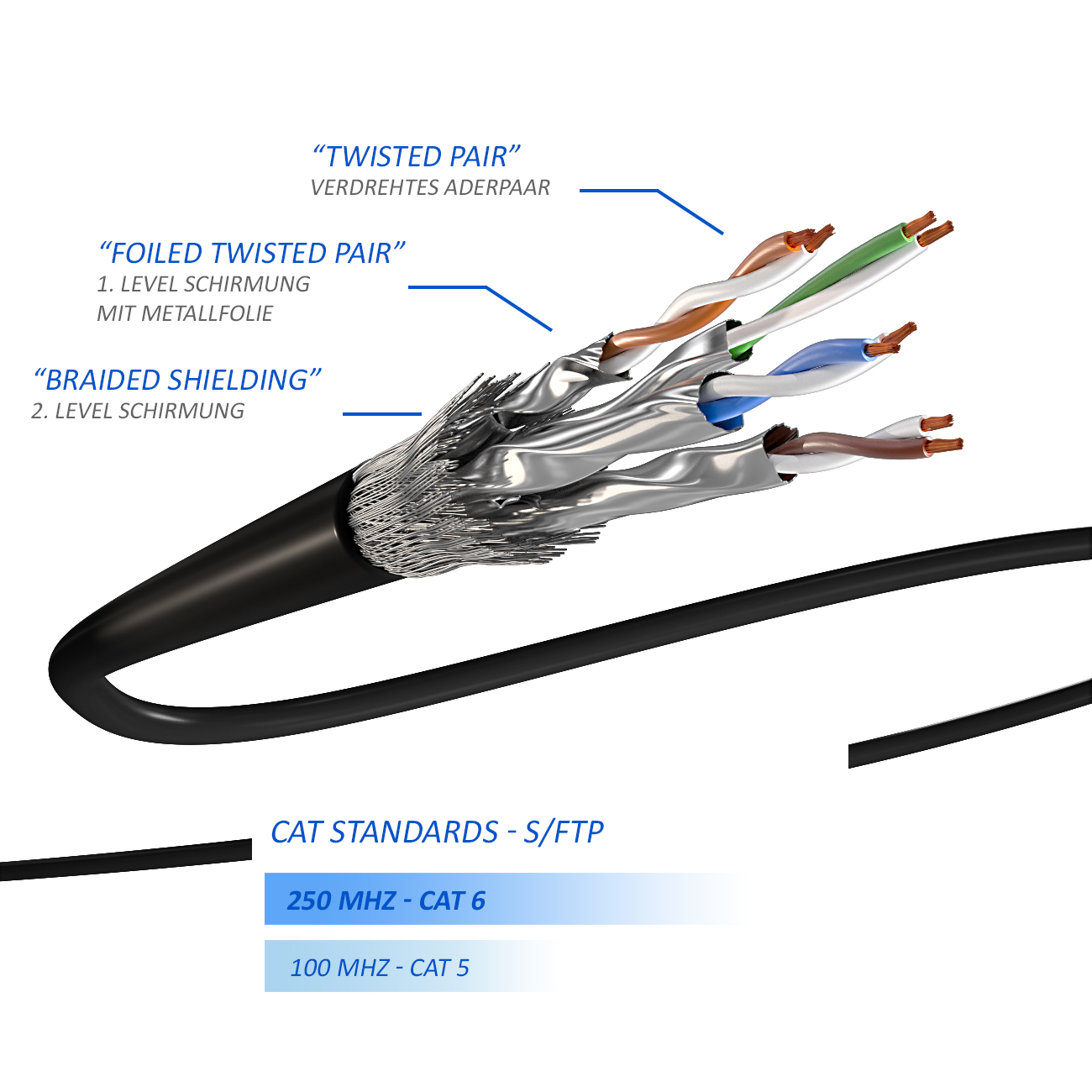 Sie besitzen besonders leitfähige, vergoldete Kontaktflächen, die für eine erstklassige, verlustfreie Datenübertragung sorgen. Die hochwertig verarbeiteten Kupferkabel besitzen eine innovative Doppel-Schirmung (S/FTP PIMF - Folie Geflecht).