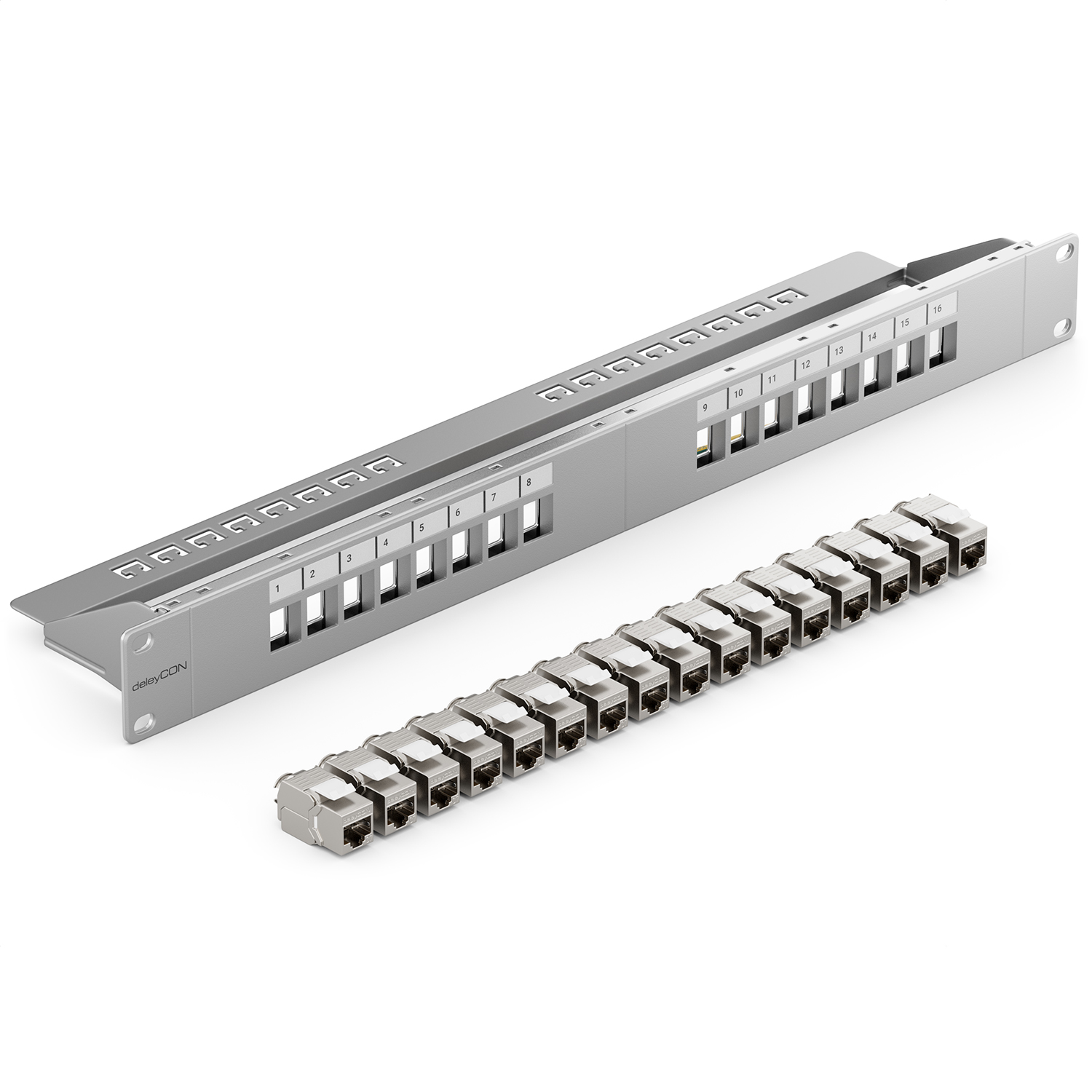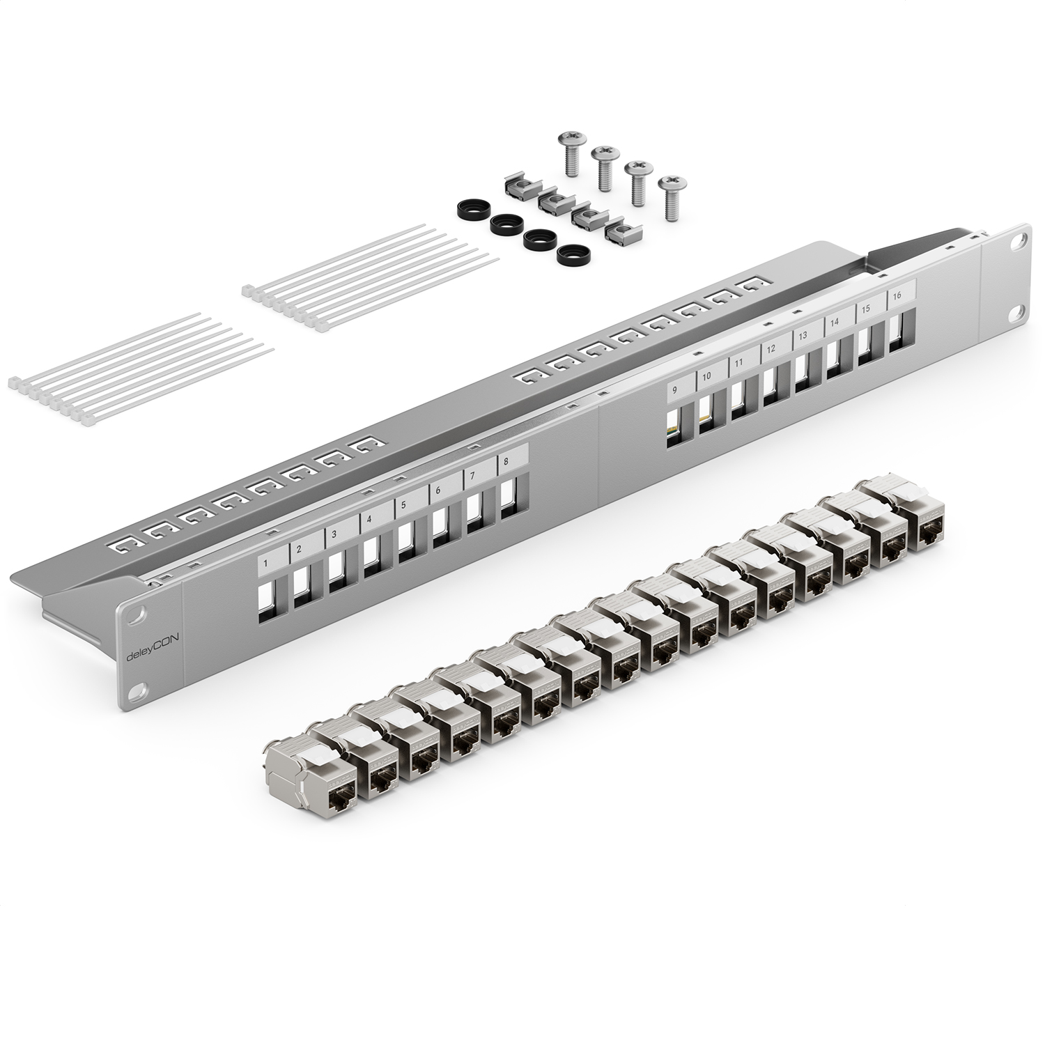 /deleycon-16-port-cat7-patchpanel-set-patchfeld-verteilerfeld-modular-1-he-19-zoll-rackeinbau-16x-cat-7-keystone-module-rj45-lan-netzwerk-10-gbit-s-600-mhz-verlegekabel-grau/