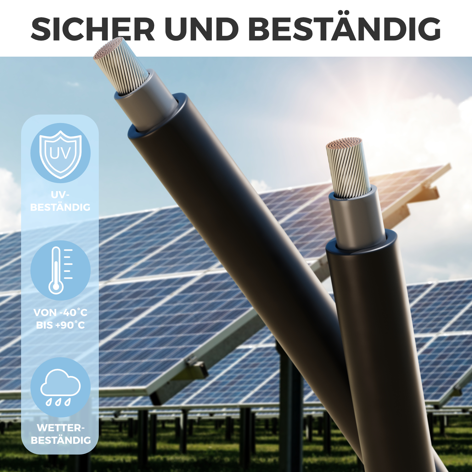 - Standards: EN 50618 & IEC 62930, VDE 0295 / IEC 60228 Klasse 5, EN 60332-1-2 (Flammwidrigkeit), IEC 60754-1 (halogenfrei), EN 60811-403, EN 50396 8.1.3 (Ozonbeständigkeit Methode A & B) EN 50289-4-17 (Witterungs-/UV-Beständigkeit)