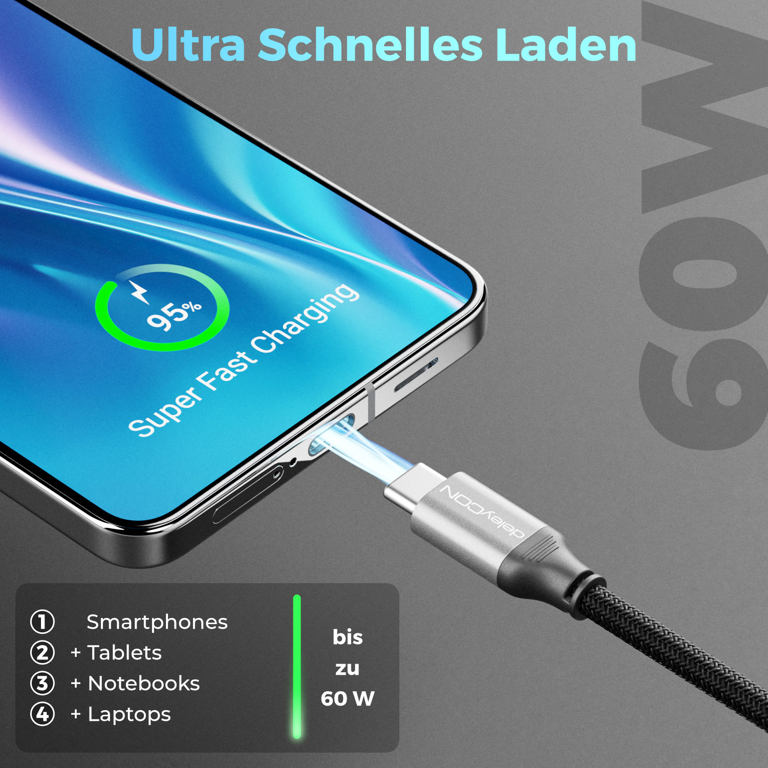 deleyCON 0,15m USB C Kabel PD3.0 60W Schnellladekabel 15cm USB-C Ladekabel