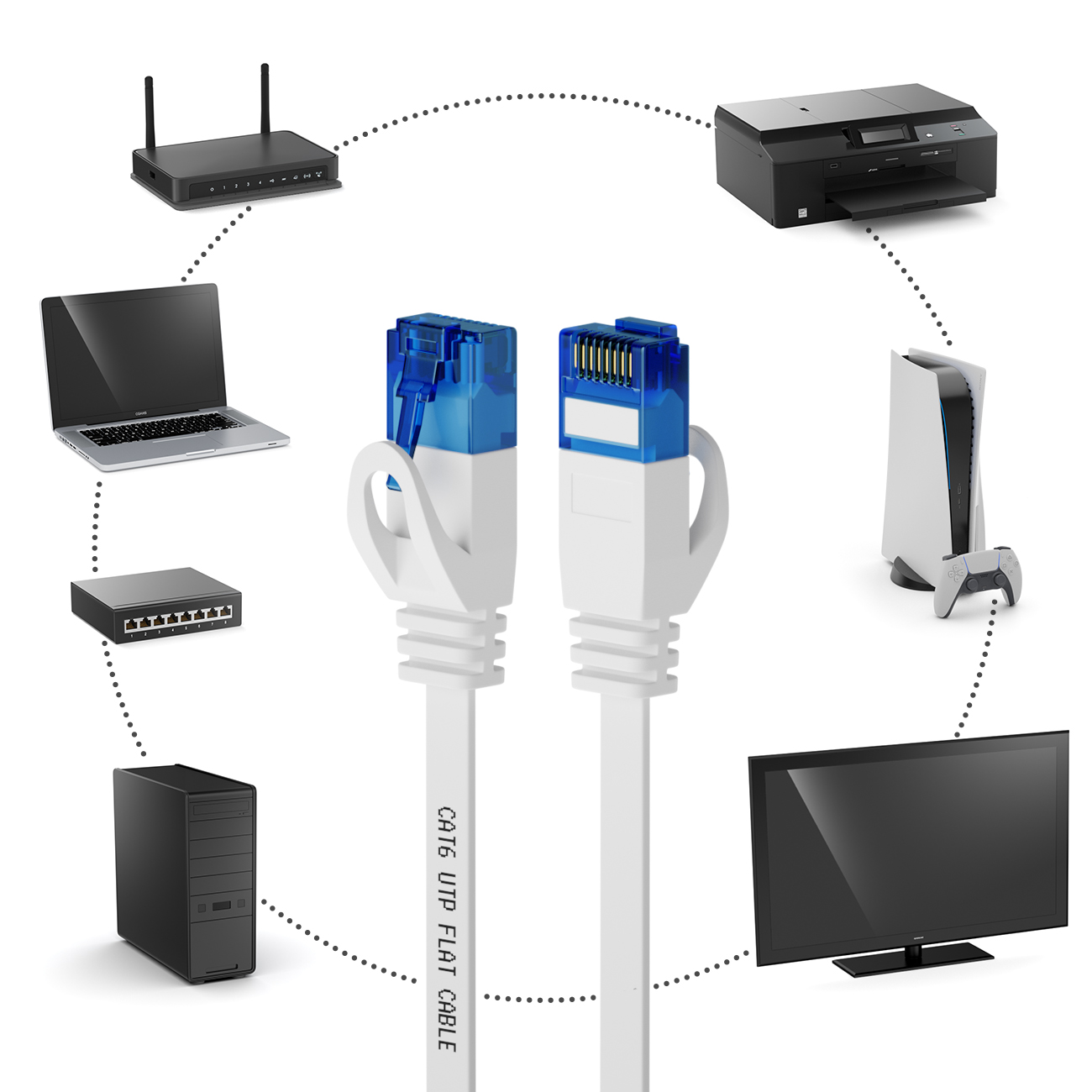 deleyCON CAT6 Netzwerk Flachkabel sind mit allen Geräten kompatibel, die über einen RJ45 Netzwerk-Anschluss verfügen. Dazu zählt unter Anderem: PC, Computer, Notebook, Laptop, Modem, DSL-Router, Switch, Netzwerk-Kameras, Netzwerk-Drucker, Spielekonsolen, Smart-TV, Hifi-Receiver, Media-Player, Internet-Radios uvm.