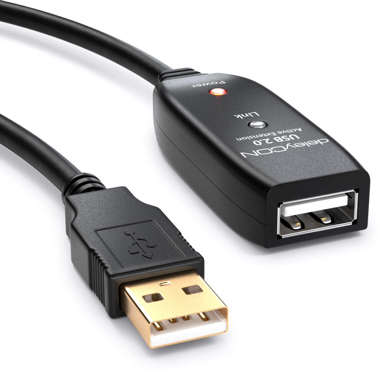 Das deleyCON USB 2.0 Verlängerungskabel ist ein unverzichtbares Zubehör für PC und Mac Benutzer, um USB-Peripheriegeräte wie Festplatten, Drucker, Teleskope und USB-Hubs hinter dem Schreibtisch oder im Raum quer zu verteilen. Der Integrierte Verstärker-Chipsatz im aktiven Verlängerungskabel wird über USB mit Strom versorgt, um die USB 2.0 Leistung von 480 MBit/s zu gewährleisten. Der blanke Kupferleiter und die Abschirmung aus Folie + Geflecht bietet eine überlegene Kabelleistung und fehlerfreie Datenübertragung.