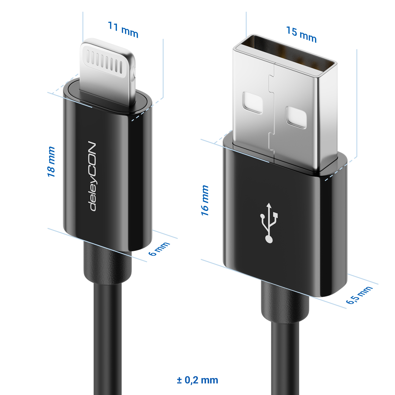 Das deleyCON Lightning USB Kabel zeichnet sich durch eine kompakte Bauweise des Steckers aus, was eine Verwendung unter z.B. einer Handyschutzhülle gewährleistet. Die Länge 2m hat aufgrund des MFI Verfahrens eine etwas dickere Kabelummantelung, als auch einen klein wenig dickeren Stecker.