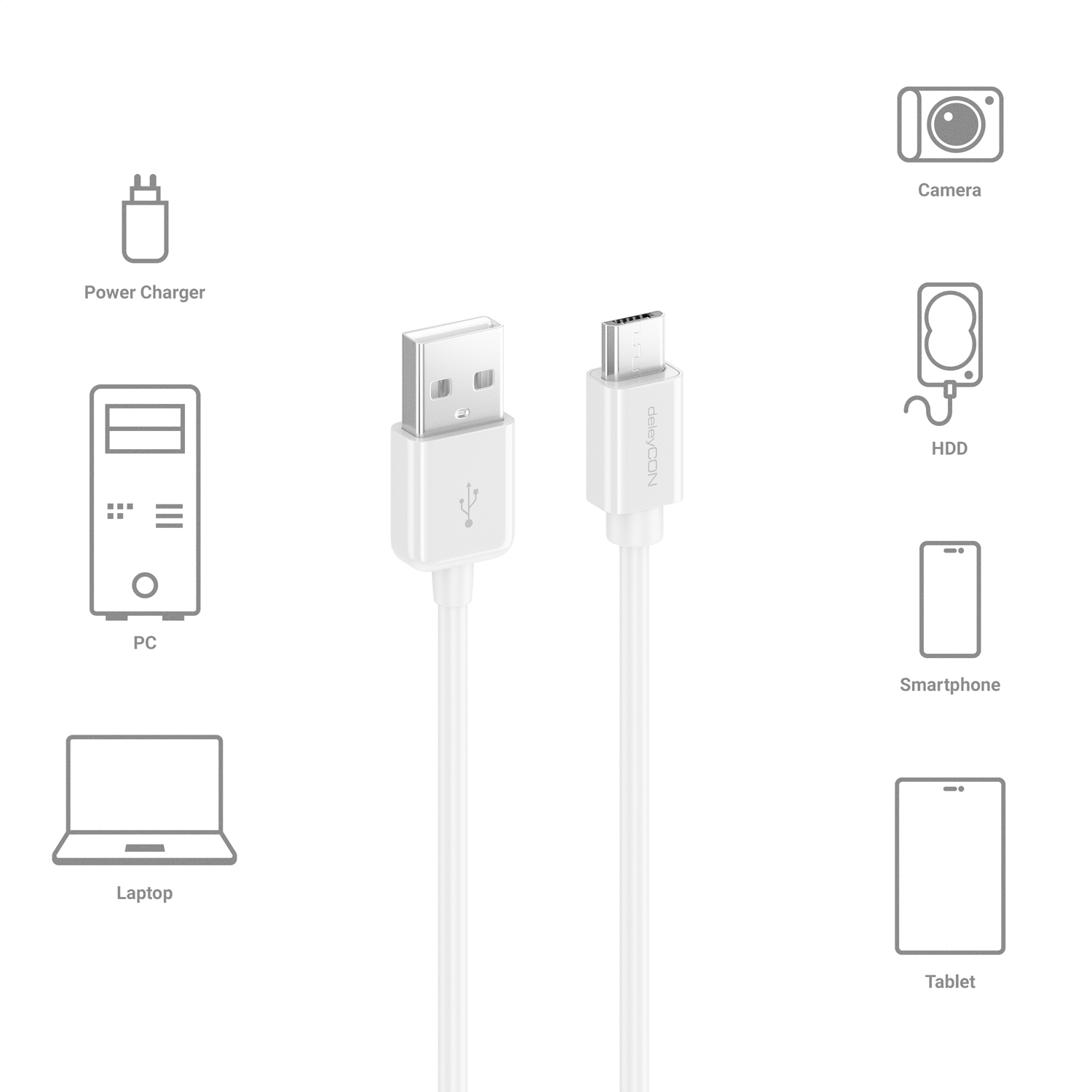 Mit dem deleyCON USB 2.0 High Speed Kabel können Sie sämtliche Geräte verbinden, die über einen USB Anschluss verfügen (USB A-Buchse / Micro B-Buchse vorausgesetzt). Hervorragend als Ladekabel und Datenkabel für Handys, Tablets und Smartphones geeignet.