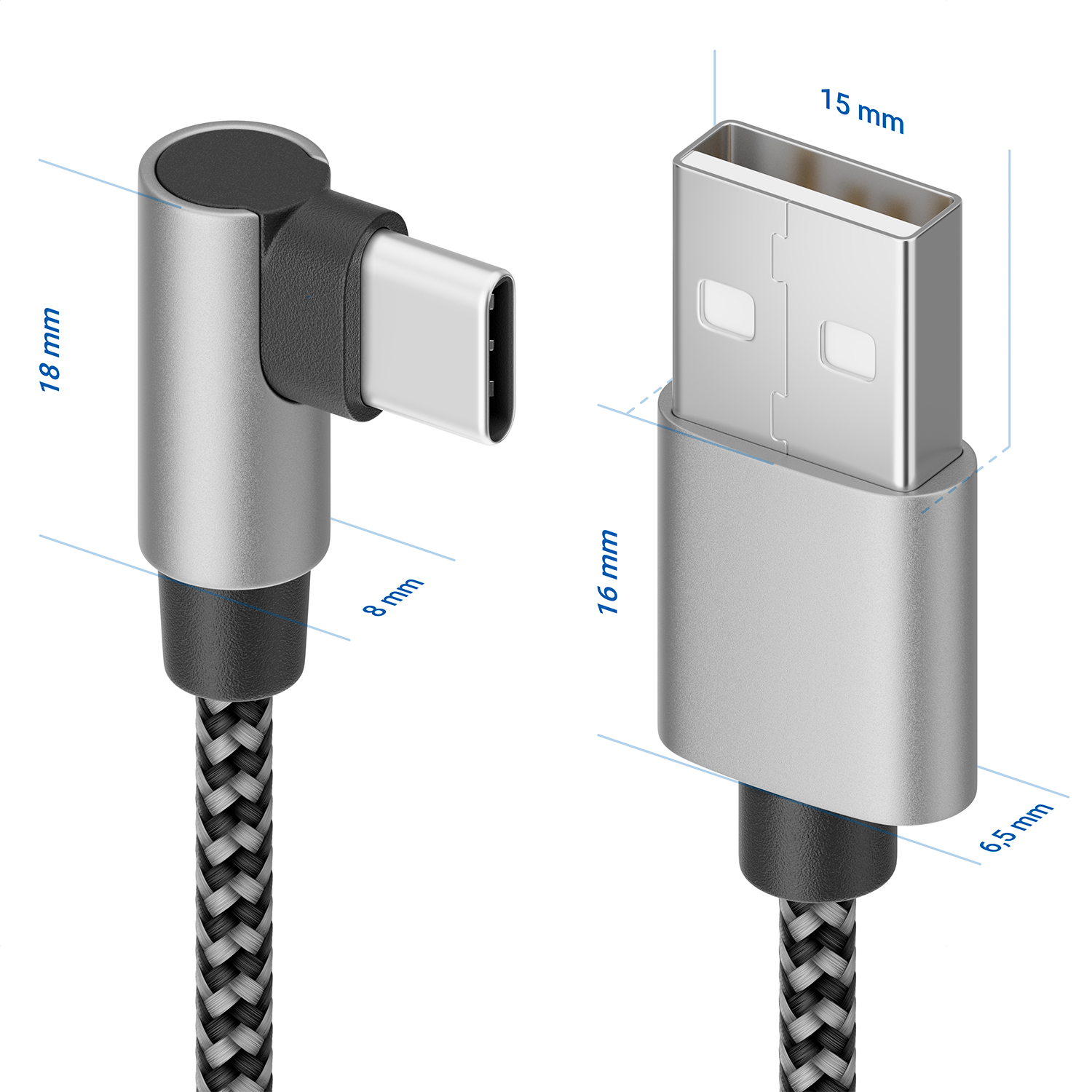 - Steckertypen: USB-A Stecker (gerade) auf USB-C Stecker (90° rechtwinklig)