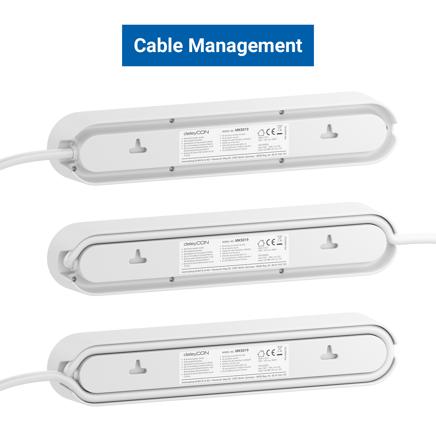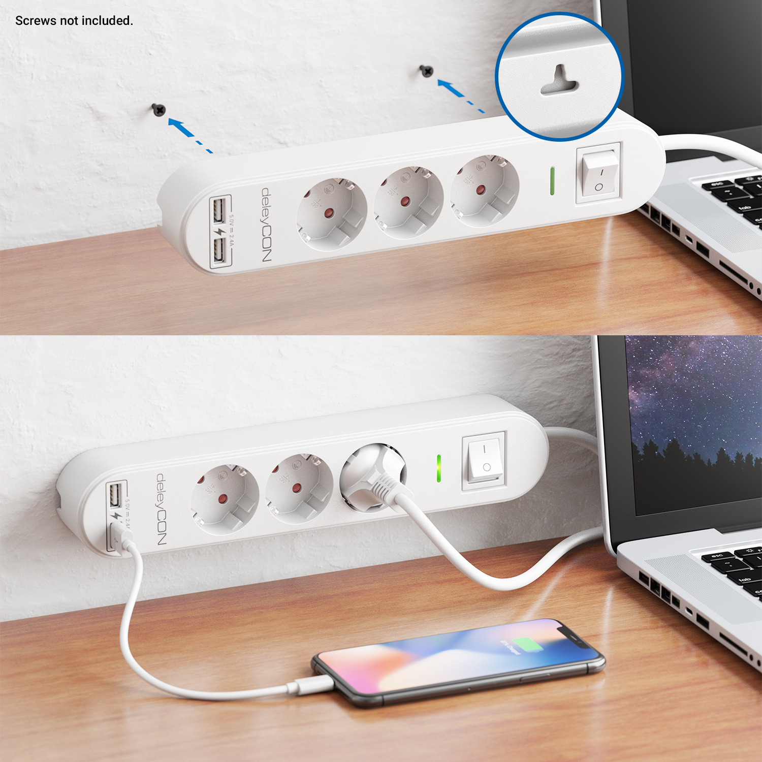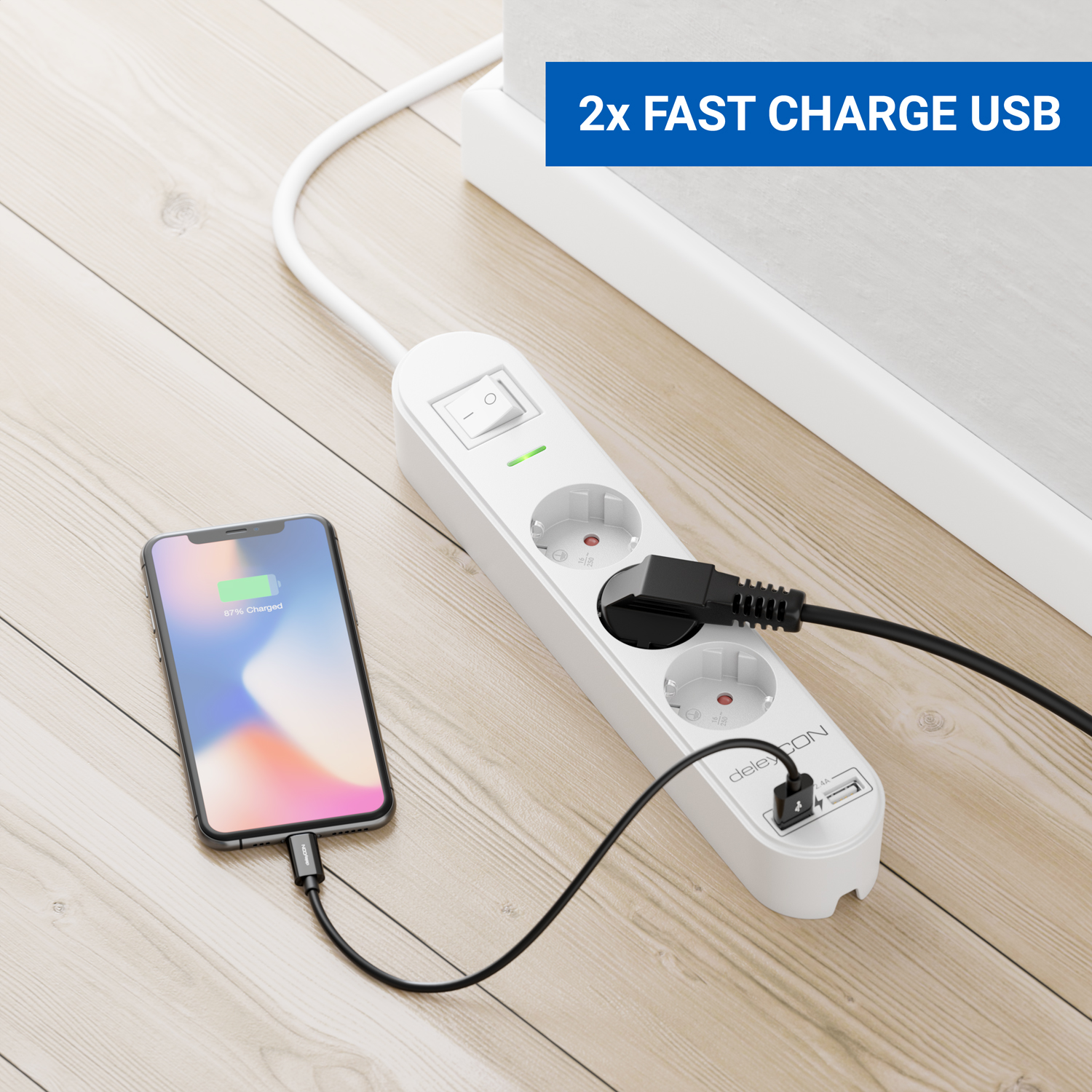 Zuverlässigkeit und Sicherheit im Haushalt und Büro. Die Steckdosenleisten von deleyCON bieten eine zusätzliche USB Lademöglichkeit für z.B. Handy und Tablet.