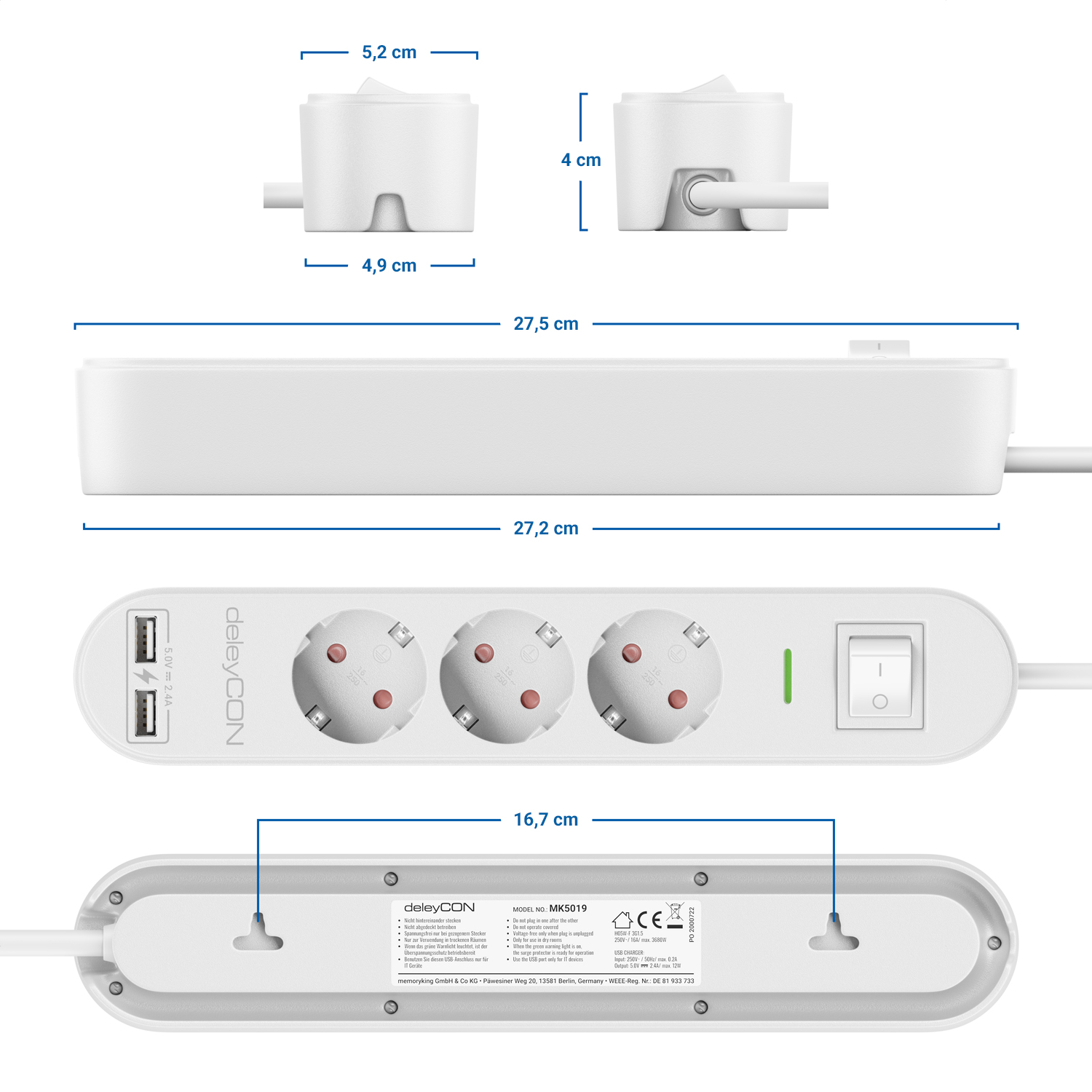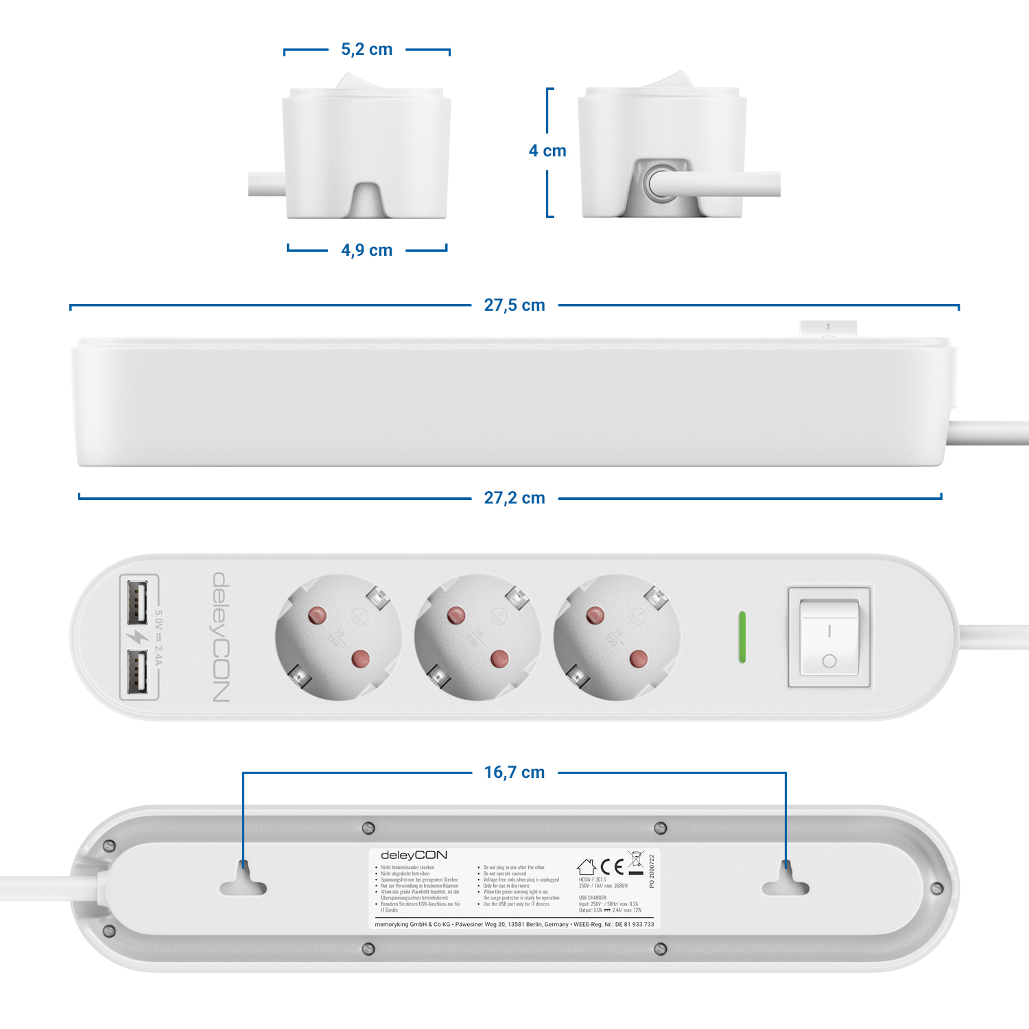 - deleyCON 3Fach Steckdosenleiste mit USB-A