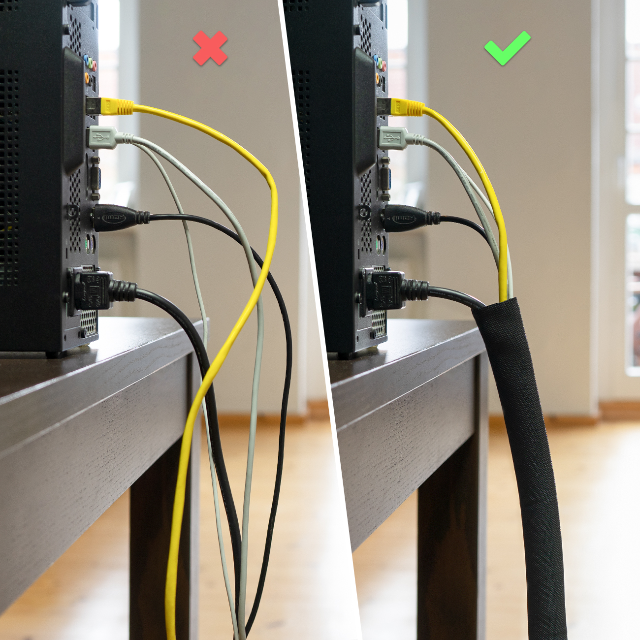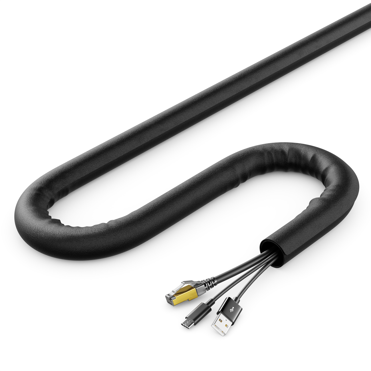 Schluss mit Kabelsalat - der selbstschließende, robuste Kabelschlauch von deleyCON ist ein optimaler Ordnungshelfer für Haushalt, Büro, Schreibtisch und Hobbyraum.