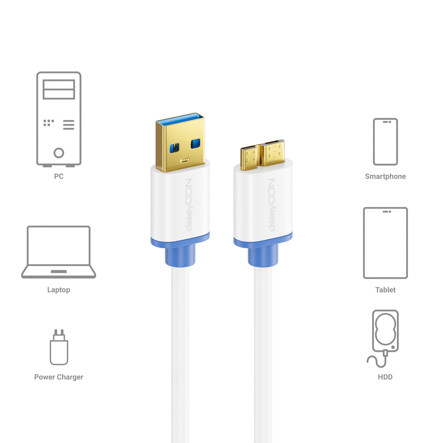 deleyCON 1,5m Micro USB 3.0 Datenkabel USB A-Stecker zu Micro B-Stecker Weiß