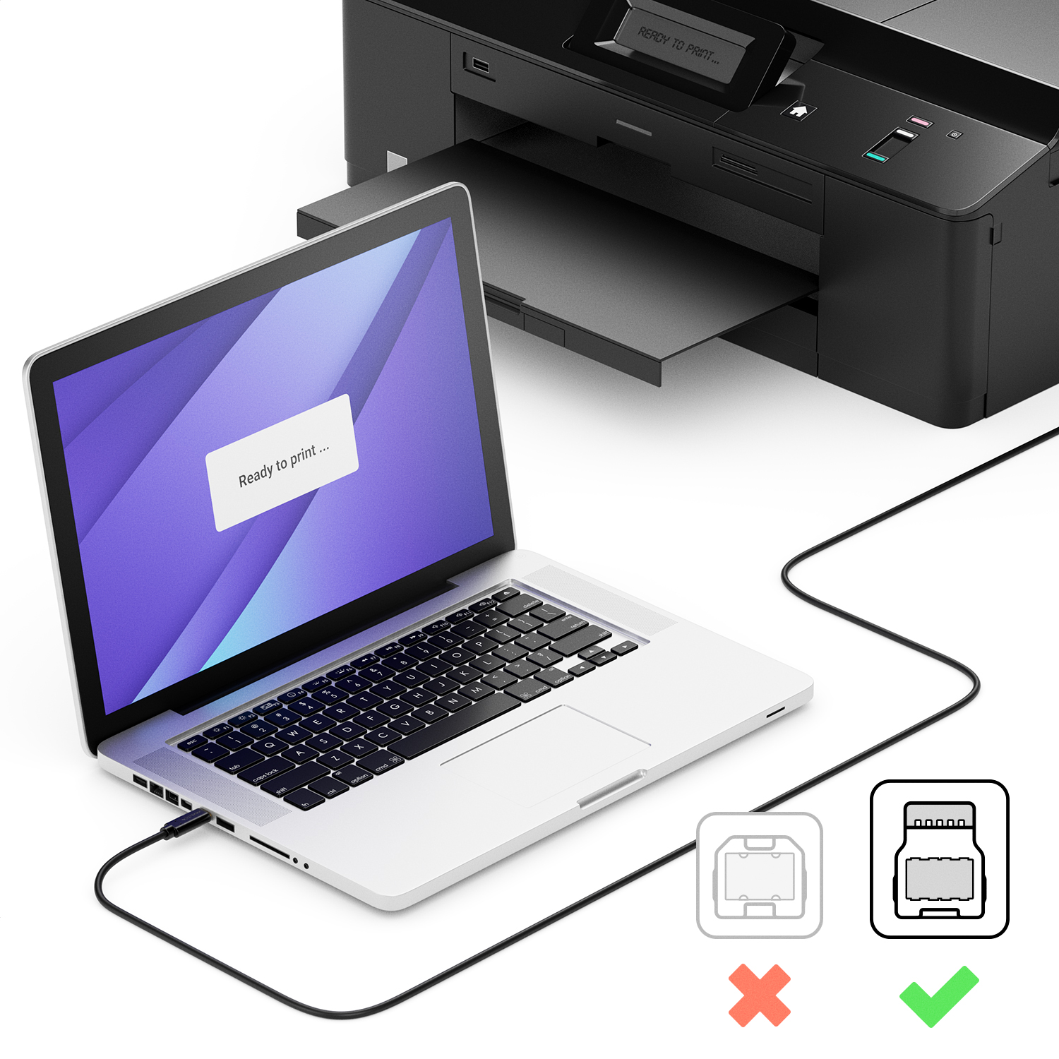 - Verbindet dein USB-C-fähiges Gerät mit USB-B Geräten (z. B. älteren Druckern, Hubs und Festplatten).