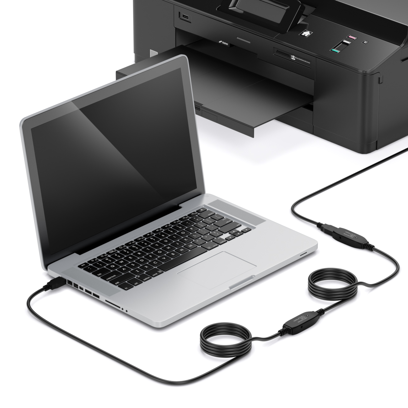Mit aktiven USB Kabeln von deleyCON können Sie Geräte wie Drucker oder Scanner über weite Entfernungen verbinden, und müssen dank Signalverstärker keinen Datenverlust befürchten.