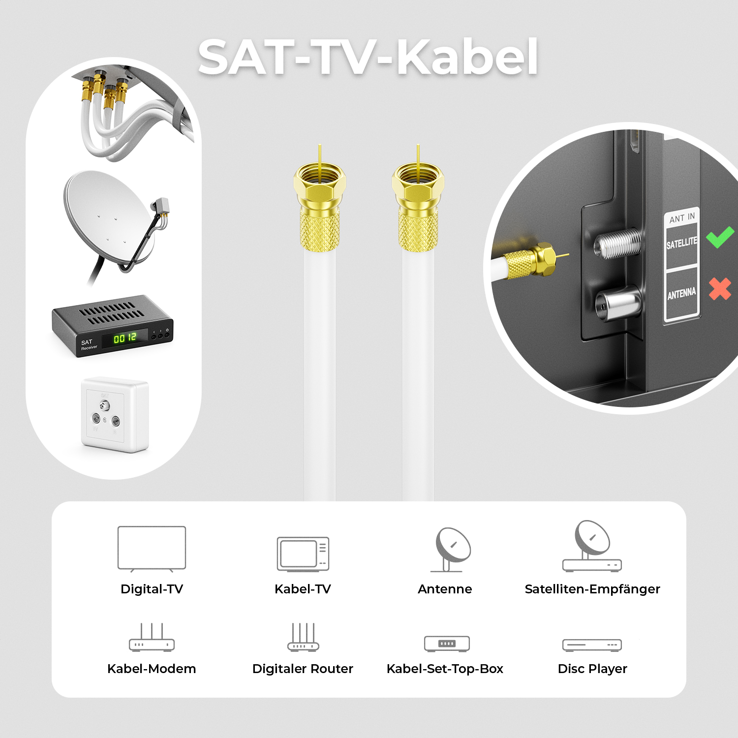 Für alle Geräte mit Koaxial SAT TV F-Buchsen Antennenanschluss wie z. B.: TV, Media-Player, TV-Receiver, DVB-S2, UKW, DAB, DAB+, SAT-Anlagen, Kabelinternet, DVB-T-Receiver, DVB-T-Sticks, WLAN-Router, DVB-S-Tuner, Computer, DVB-C-Tuner, Audio- und Videogeräte, Verstärker, Splitter, Funkanlagen, Elektronische Geräte, Fernseher, Satellitenreceiver, Radios, Kabelboxen, Kameras, Videorekorder, Kabelmodem, Internetrouter, Kupplung