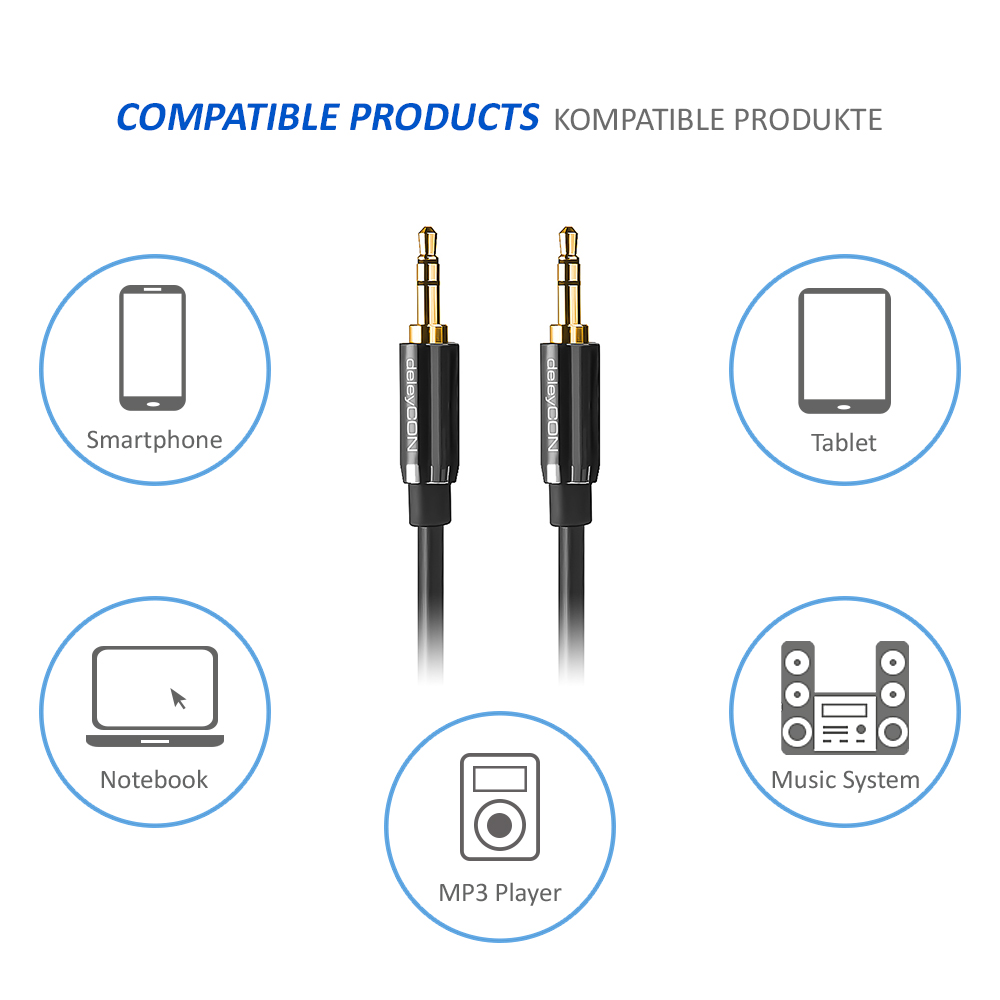deleyCON 3,5mm Klinken AUX Kabel können Universell an allen Geräten eingesetzt werden, die über einen 3,5mm Klinken Eingang verfügen. Kompatibel zu Geräten wie z.B.: PC, Computer, Laptop, Notebook, Netbook, Handy, Smartphone, Tablet, MP3-Player, KFZ, Autoradio, HiFi-Receiver und viele Weitere.