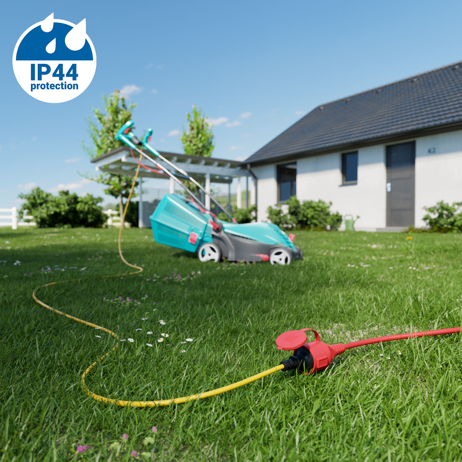 - Spritzwasserbeständig (Schutzart IP44): Mit der Schutzart IP44 ist dieses Kabel spritzwasserbeständig und eignet sich hervorragend für den Einsatz im Garten, beim Rasenmähen, am Gartenteich oder auf Baustellen