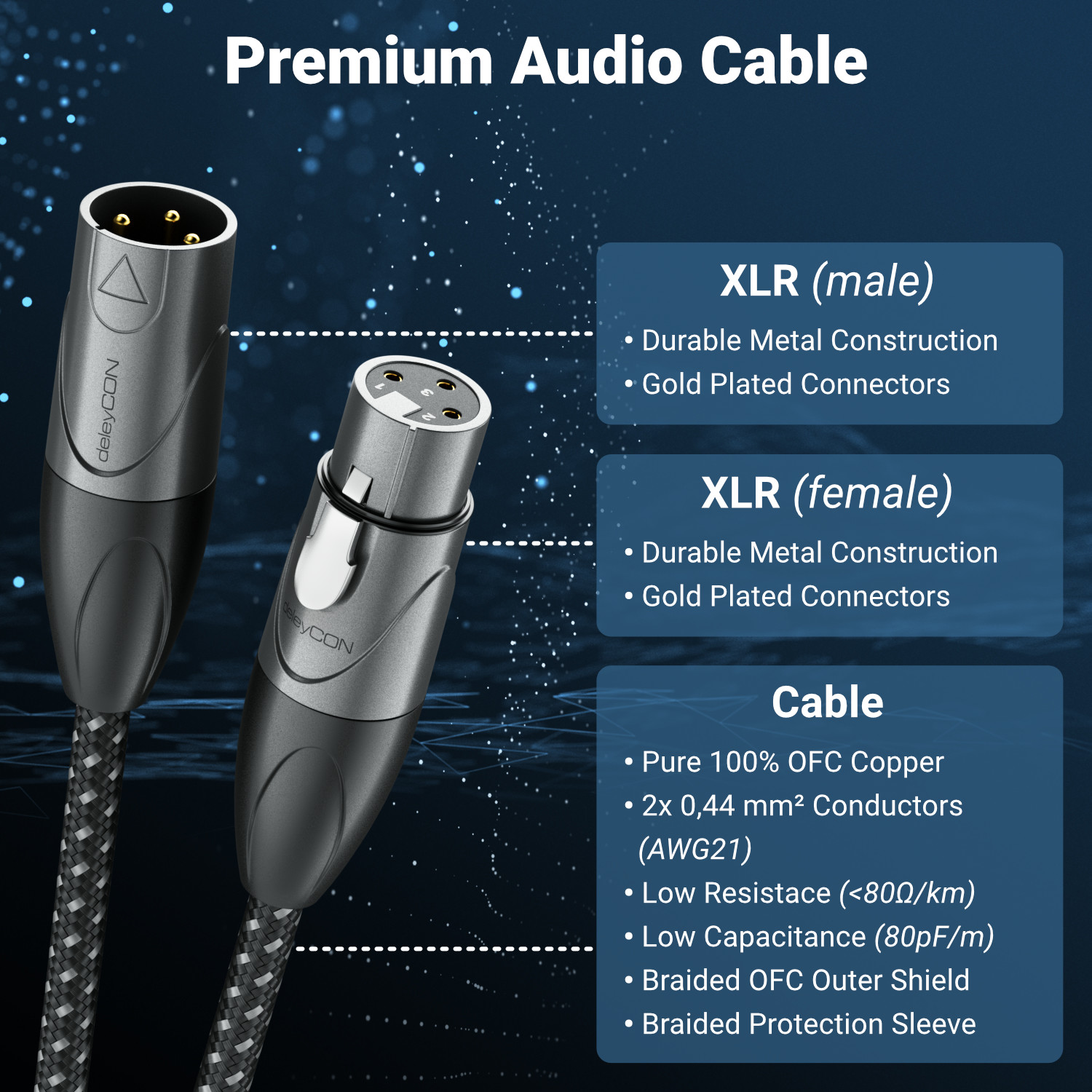 Das XLR Audiokabel von deleyCON ist das perfekte Profi-Zubehör für audiophile, die Musik zu Hause über hochwertiges Stereoequipment genießen, für Mikrofonkabel oder kristallklaren Sound und zuverlässige Bildübertragung auf Großveranstaltungen. Dieses Kabel findet vielfältigen Einsatz in der Tontechnik und genügt auch höchsten Ansprüchen im professionellen Tonstudio und Instrumenten Bereich. Dieses Kabel verfügt über eine Metallverriegelung und vergoldeten Kontakten für eine verlustfreie Übertragung in Studioqualität.