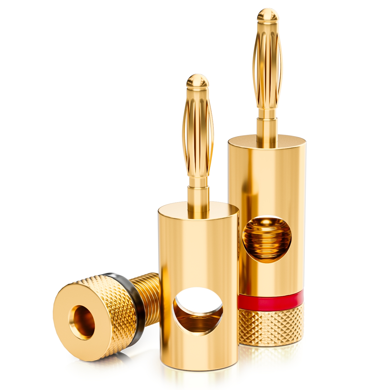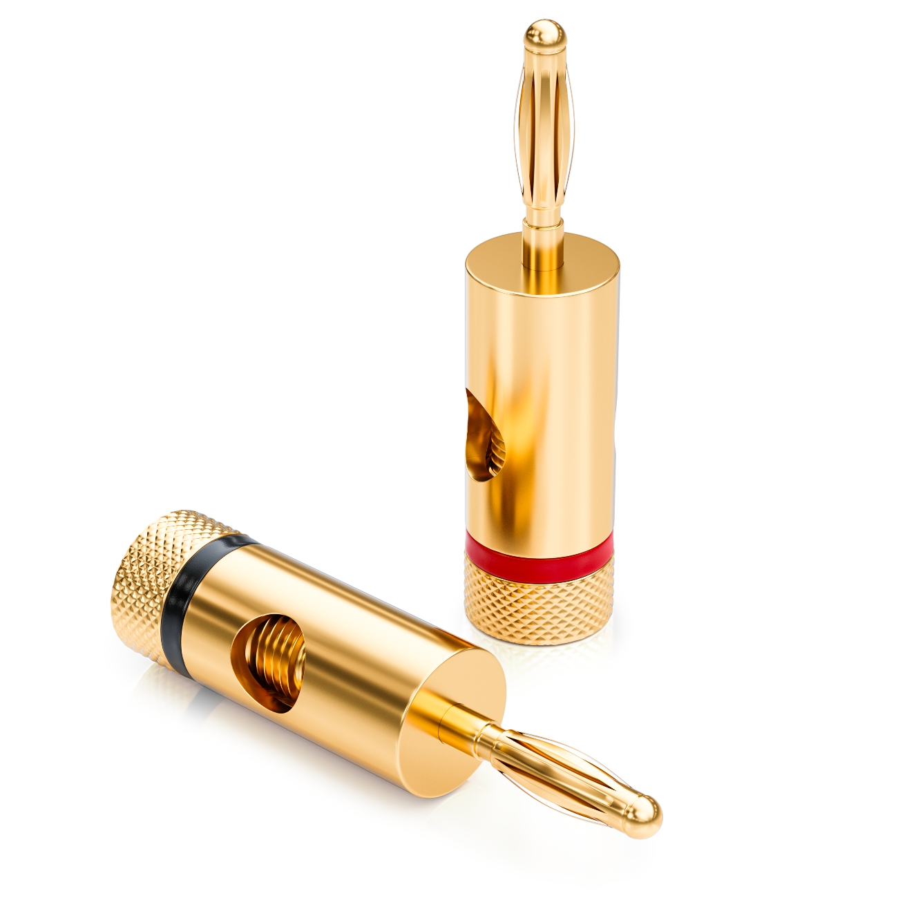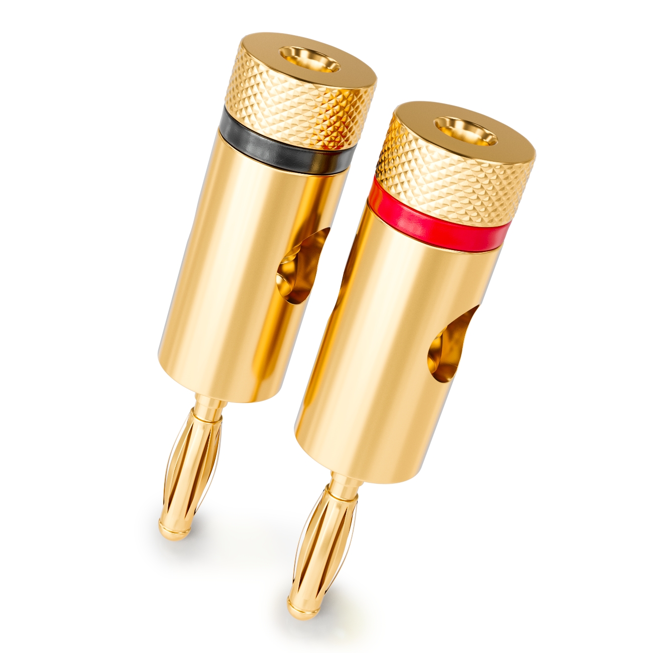 Dank der passgenauen Verschraubung sitzen die Kabel fest und sicher. Sie lassen sich wahlweise verschrauben oder verlöten. Der rote und schwarze Ring dient zur farblichen Kennzeichnung der Anschlüsse. Die hochwertigen 24K verarbeiteten Stecker garantieren eine exzellente Übertragung ohne Verzerrungen. Die doppelte Verschraubung ist ebenfalls 24 K vergoldet und sorgt durch zwei Madenschrauben für einen noch besseren Kontakt.