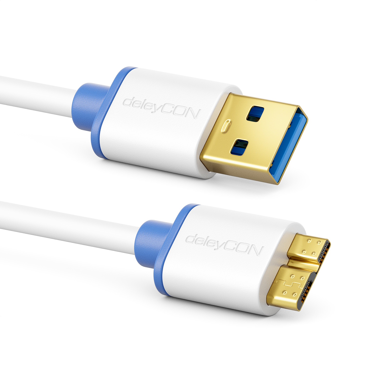 Mit dem hochwertigen deleyCON USB 3.0 Super Speed Kabel können Sie sämtliche Geräte verbinden, die über einen USB Anschluss verfügen. (USB A-Buchse/Micro B-Buchse) Sie sind hervorragend geeignet, um Geräte wie z.B. Festplattengehäuse, USB-Hubs, Digitalkameras, Navis, MP3-Player, externe Festplatten uvm. zu verbinden.