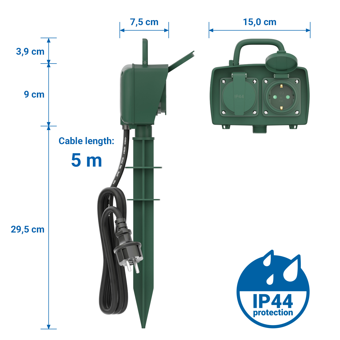 deleyCON 2 Fach Outdoor Steckdose mit Erdspieß IP44 Garten Terrasse 5m Kabel