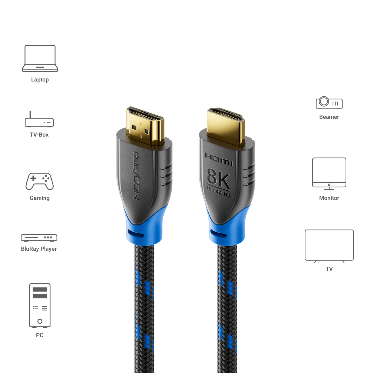 deleyCON 8K UHD HDMI 2.1 Kabel - Zukunftssicher konzipiert für höchste HD Audio- und Videoansprüche - Überragende Detailtreue und erstklassige Soundqualität.