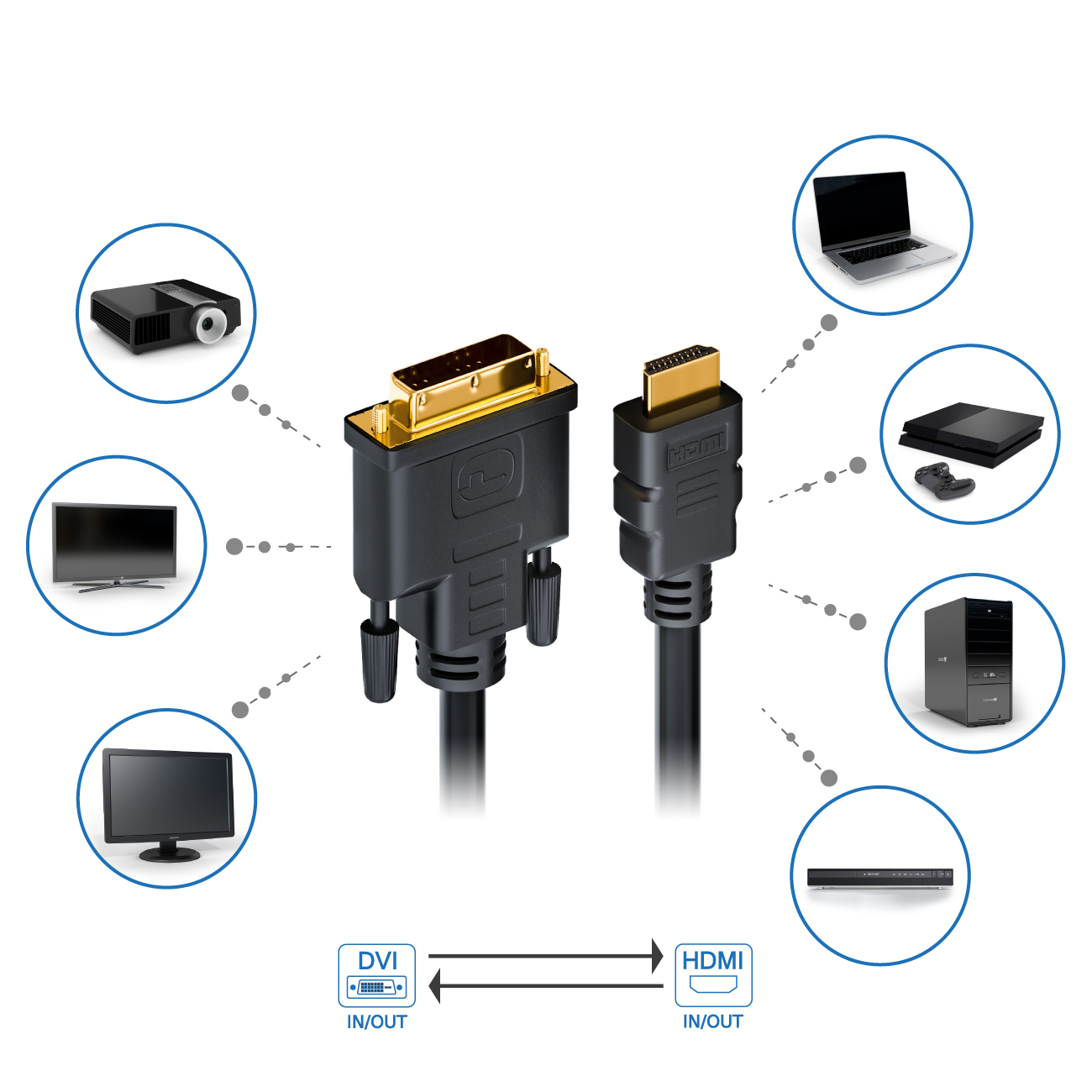 Das deleyCON High Speed HDMI zu DVI Kabel unterstützt Auflösungen höher als Full HD 1080P (1920 x 1080) von bis zu WQXGA (2560 x 1600) Passend zu allen Geräte mit HDMI Anschluss: Plasma/TFT TV, DVD, Blu-Ray, PS3, Xbox, Beamer.