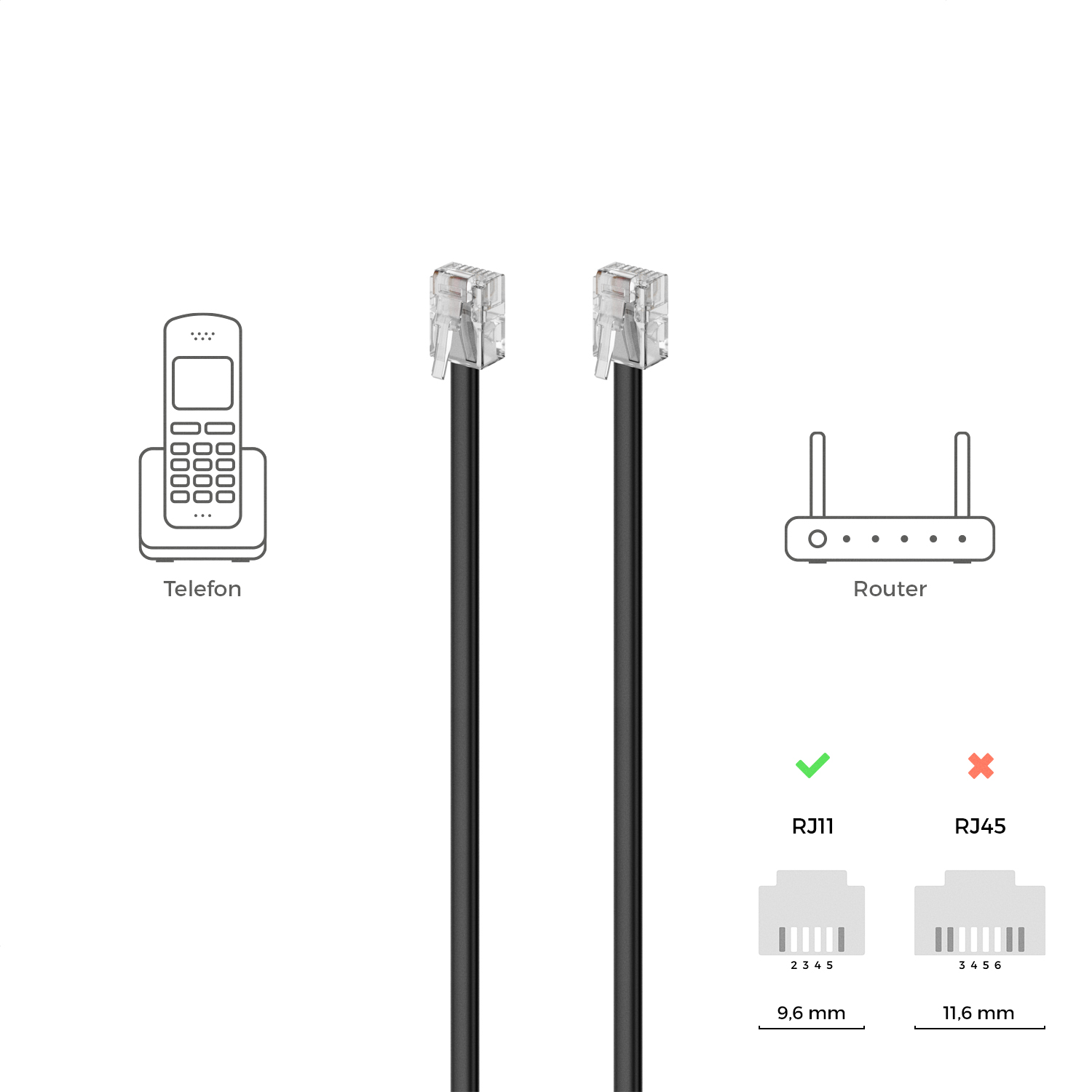 - Passgenaue, genormte RJ11 Stecker