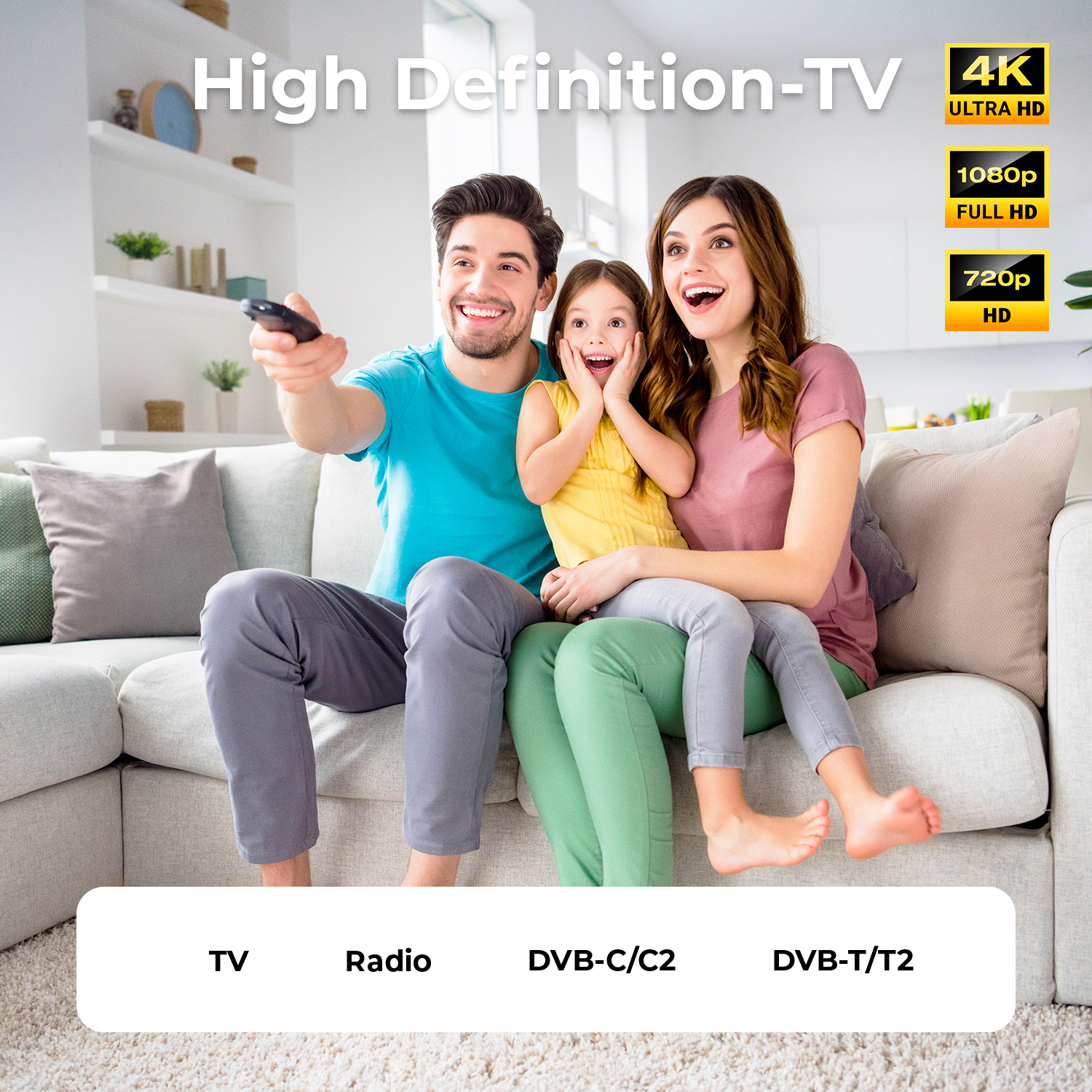 - Kompatibel zu TV, Radio, DVB-T, DVB-T2, DVB-C, UKW, DAB, DAB+