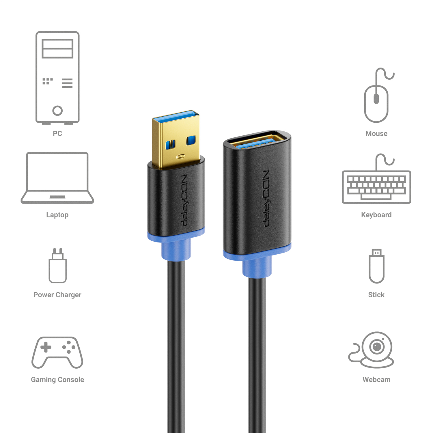 Mit dem hochwertigen deleyCON USB 3.0 Super Speed Verlängerungskabel können Sie vorhandene USB Kabel verlängern oder eine Vielzahl von USB Geräte anschliessen. Sie sind hervorragend geeignet, um Geräte wie z.B. Drucker, Tastaturen, Mäuse, Webcams, Festplattengehäuse, USB-Hubs uvm. zu verbinden.