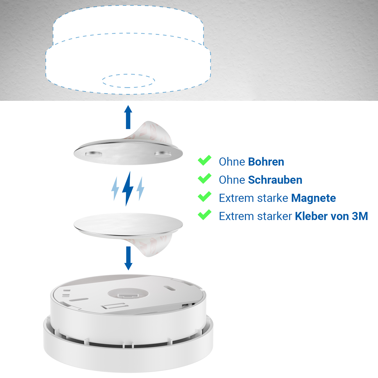 - Einfaches Befestigen am Rauchmelder und der Decke