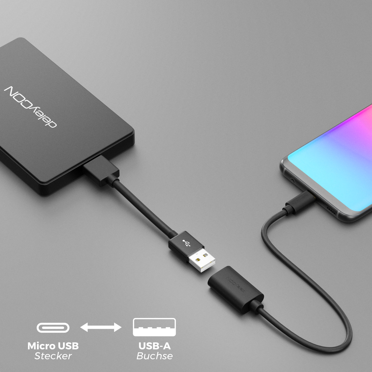 In dieser Variante bietet der deleyCON USB 2.0 High Speed OTG Adapter folgende Anschlüsse: 1x USB A-Buchse zu 1x USB Micro B-Stecker.