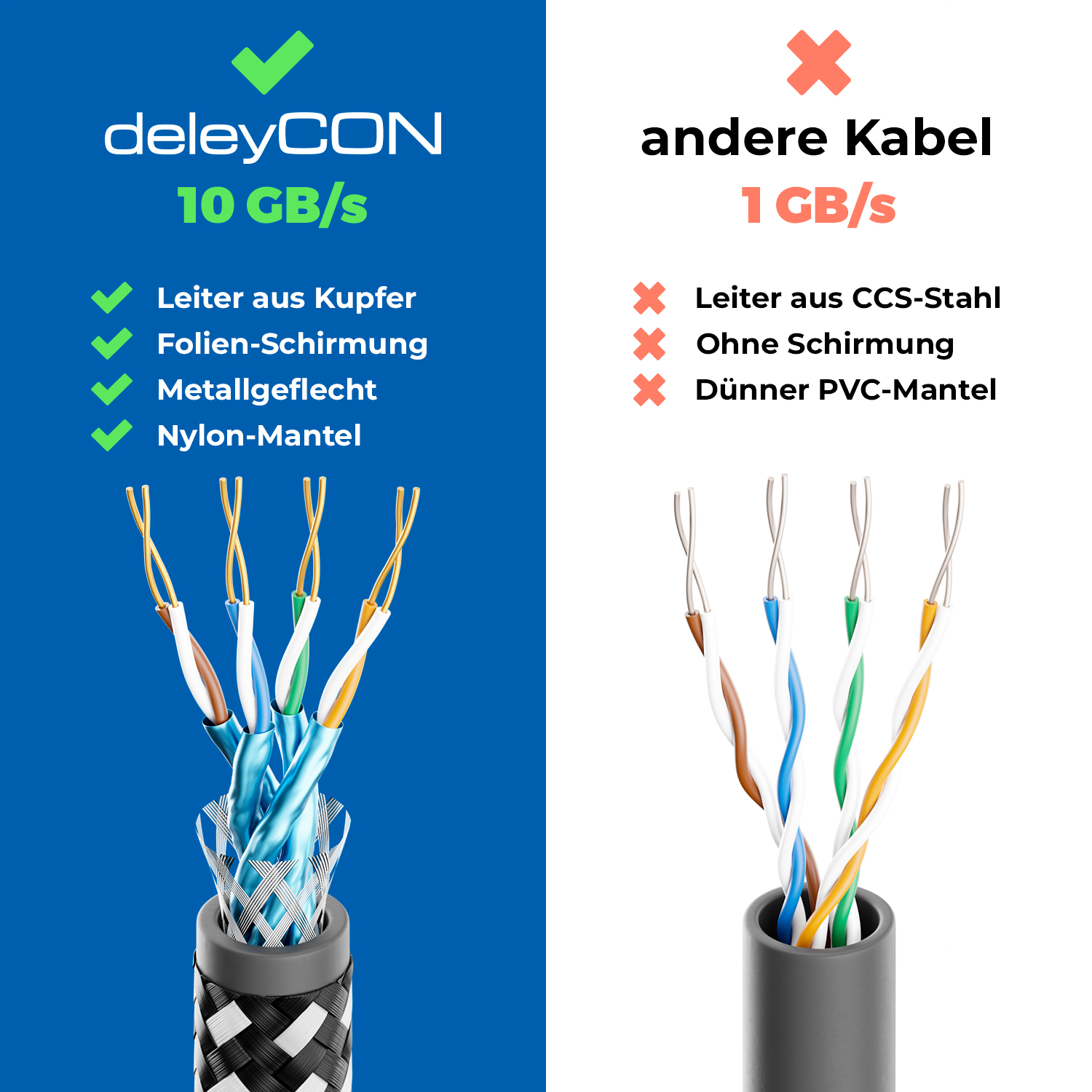 Das deleyCON Cat7 Patchkabel ermöglicht ultraschnelle Netzwerkverbindungen mit bis zu 10 Gbit/s und einer Frequenz von 600 MHz – ideal für stabile Datenübertragungen ohne Verzögerung.