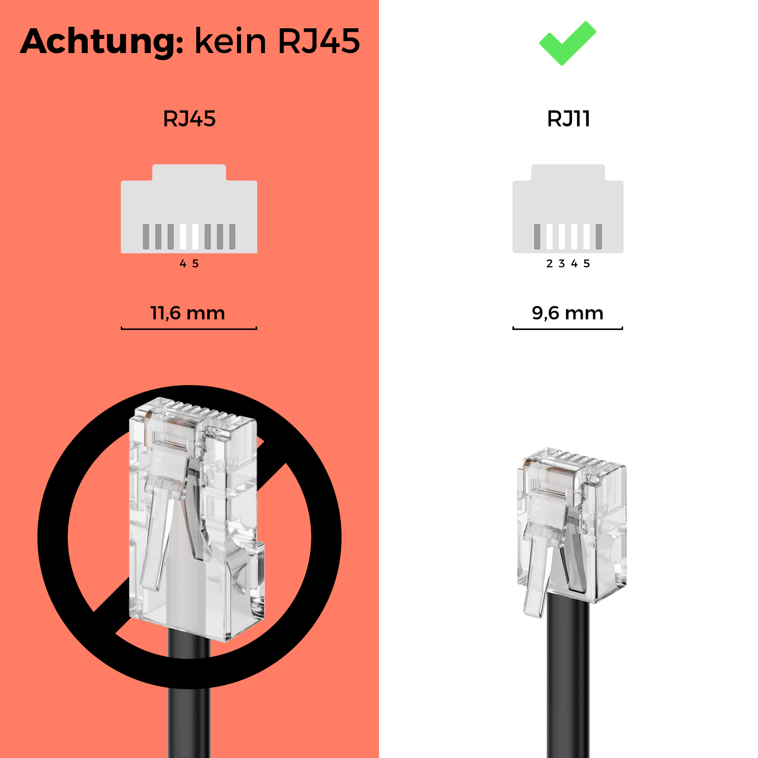 - Passgenaue, genormte RJ11 Stecker