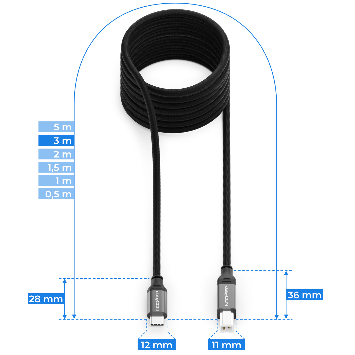 deleyCON 3,0m USB C Druckerkabel für Drucker Scanner MIDI USB-C auf USB-B Kabel