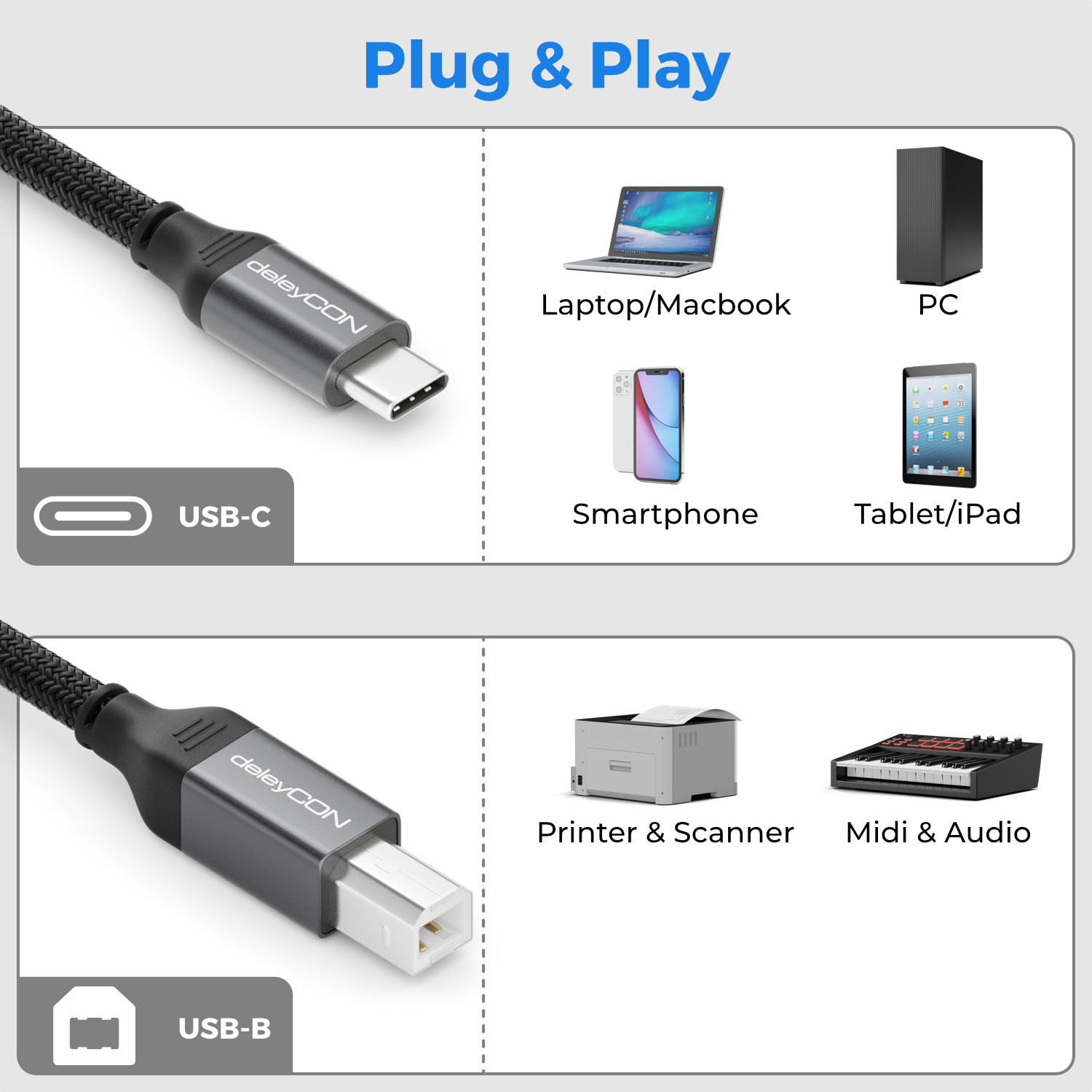 Das deleyCON USB-C auf USB-B Kabel verbindet Ihre modernen Geräte mit USB-C Anschluss wie iPhone, Tablets, Notebooks und mehr mit Druckern, Scannern oder MIDI-Geräten. Dank des robusten, geflochtenen Designs und Aluminiumgehäuse garantiert das Kabel höchste Langlebigkeit und zuverlässige Datenübertragung.