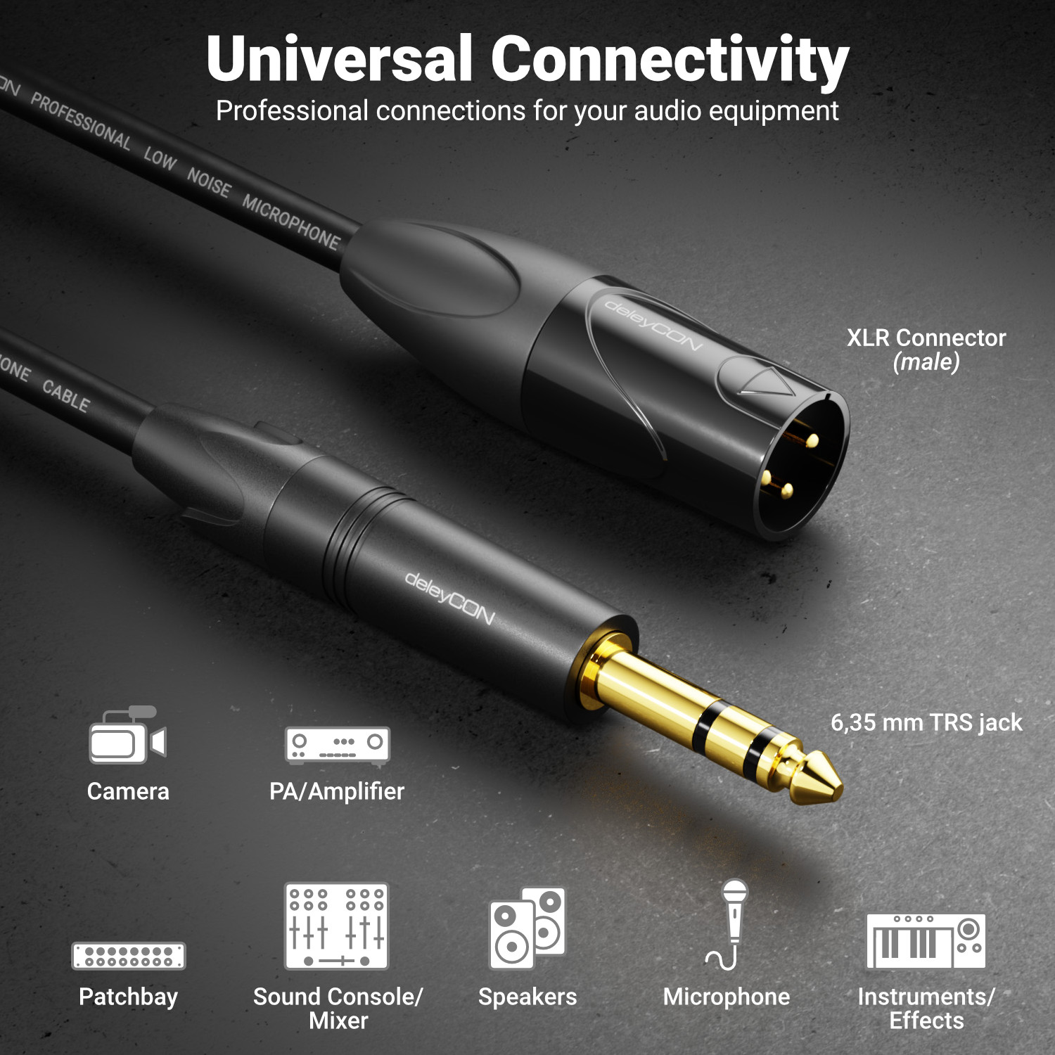 Das XLR Audio Adapter Kabel von deleyCON ist das perfekte Profi-Zubehör für audiophile, die Musik zu Hause über hochwertiges Stereoequipment genießen, für Mikrofonkabel oder kristallklaren Sound auf Großveranstaltungen. Dieses Kabel findet vielfältigen Einsatz in der Tontechnik und genügt auch höchsten Ansprüchen im professionellen Tonstudio und Instrumenten Bereich. Dieses Kabel verfügt über eine Metallverriegelung und vergoldeten Kontakten für eine verlustfreie Übertragung in Studioqualität.