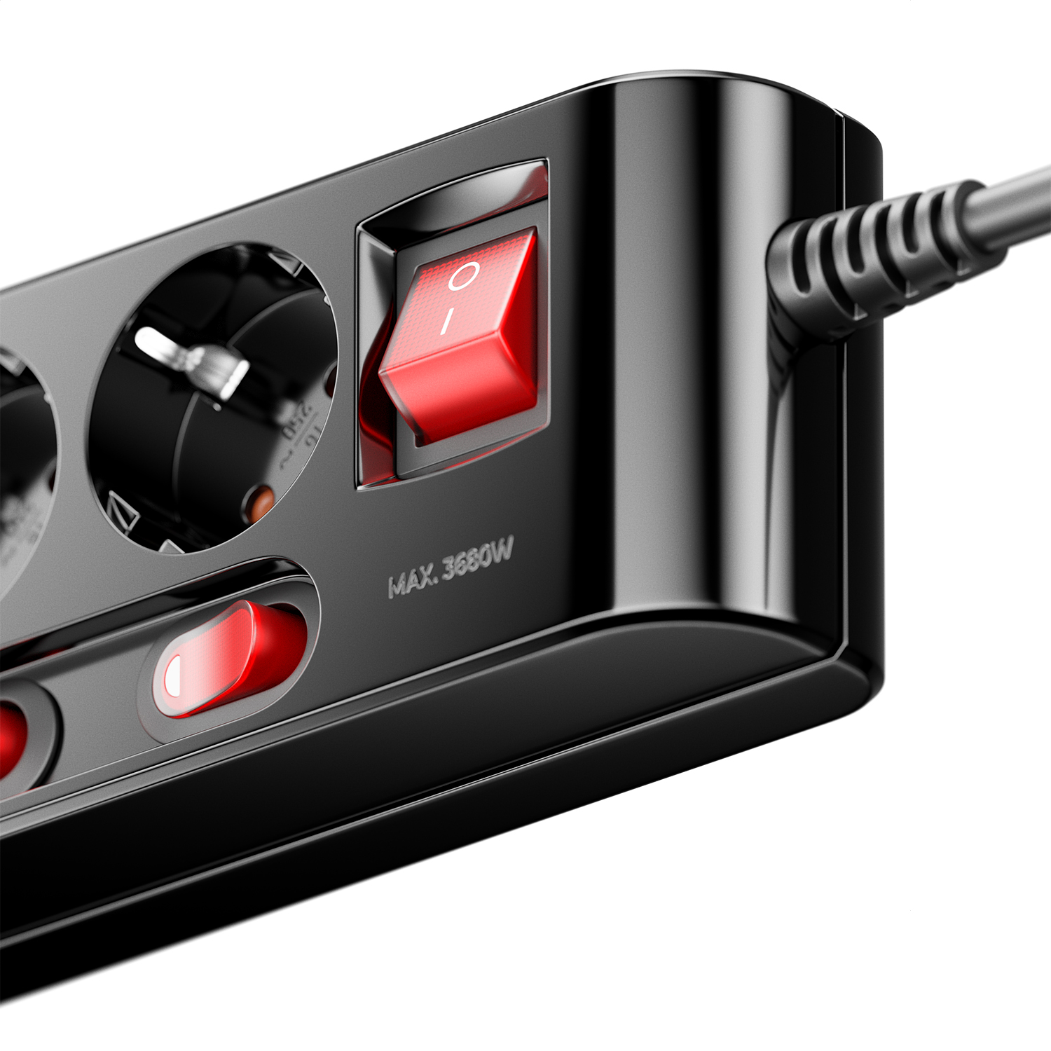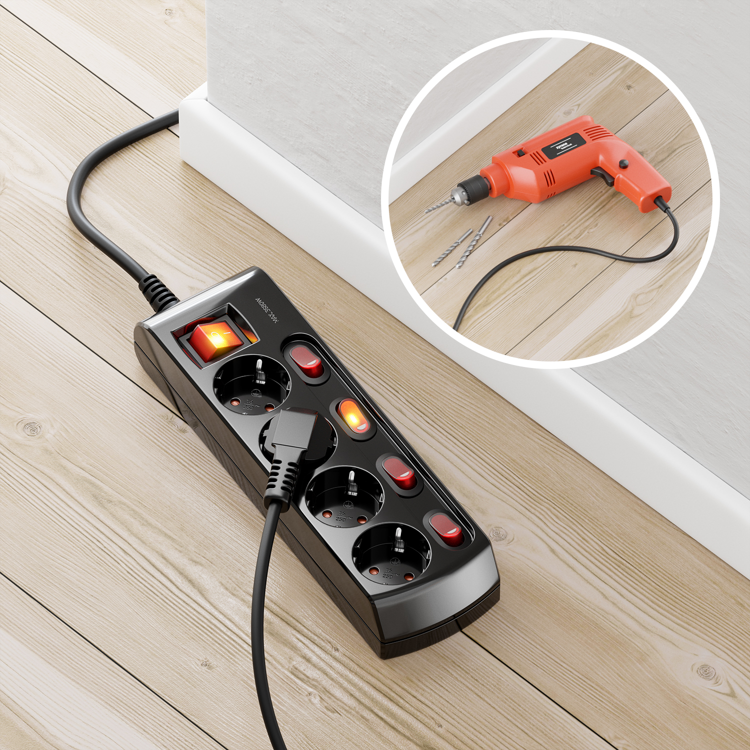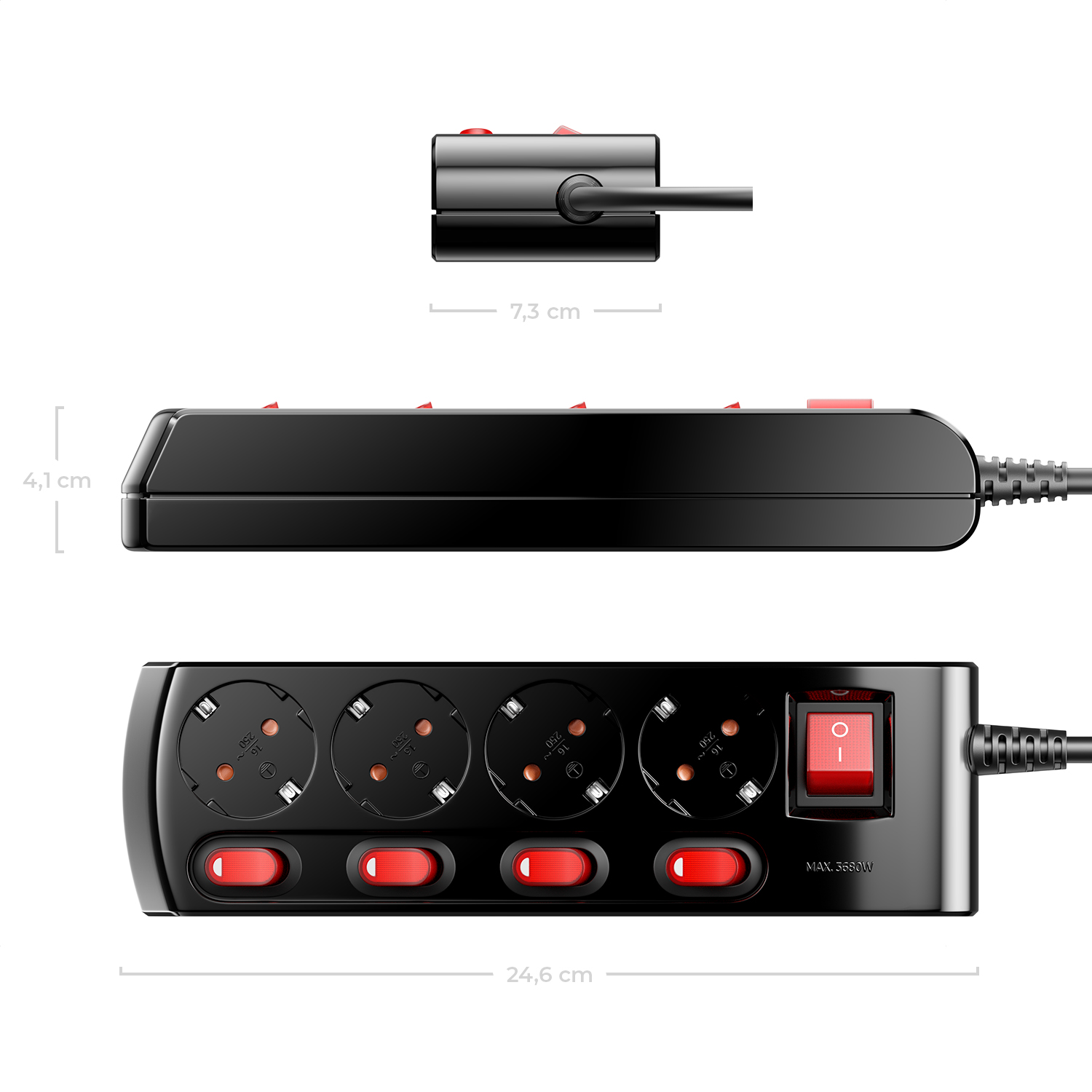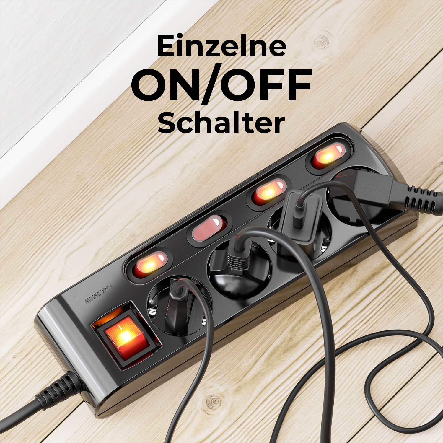 - Schalter: Hauptschalter und individuelle Schalter für jede Steckdose