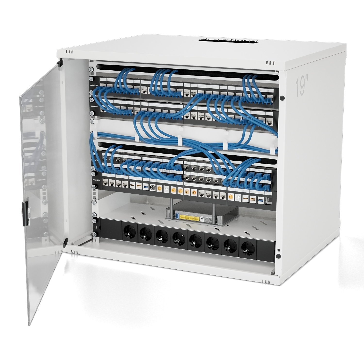deleyCON 8 Port Patchpanel Gehäuse 1HE Keystone Module z.B. RJ45 BNC Schwarz