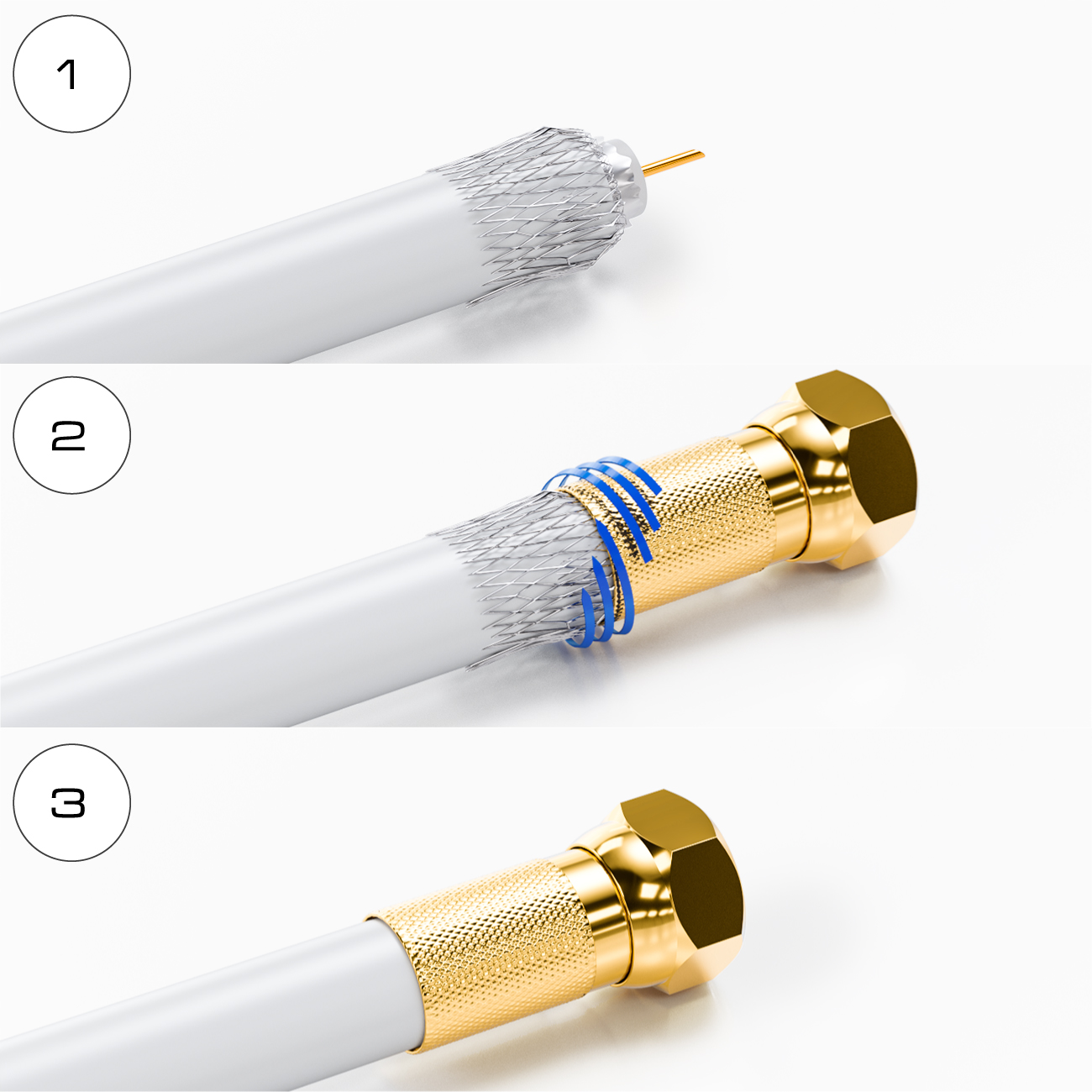 10 Stück hochwertig vergoldete F-Stecker sind im Lieferumfang enthalten, somit haben Sie alles was zum Verlegen und Anschliessen benötigt wird.