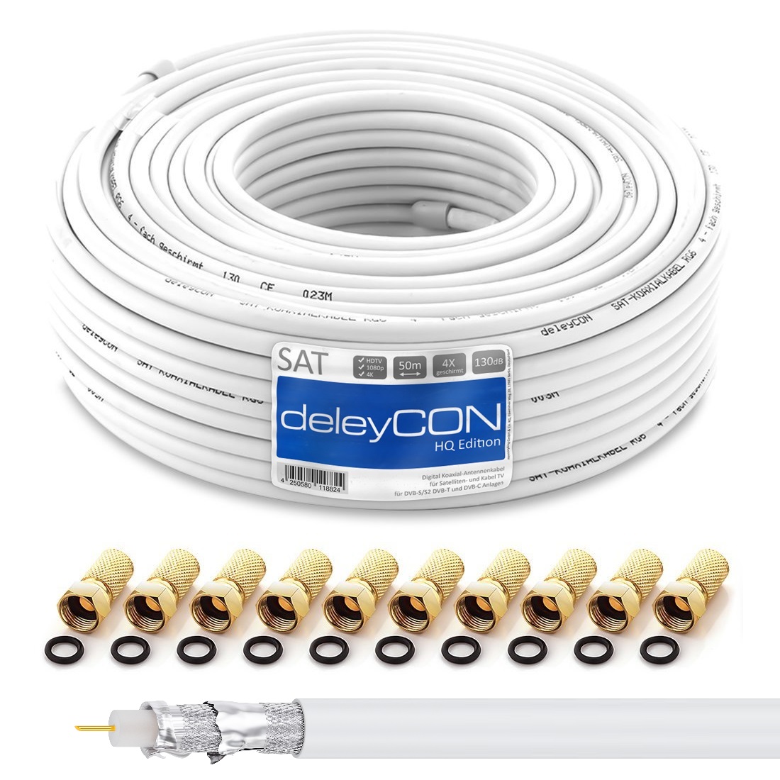 deleyCON 50m HQ SAT Kabel HDTV 130dB 4x geschirmt + 10x F-Stecker - vergoldet