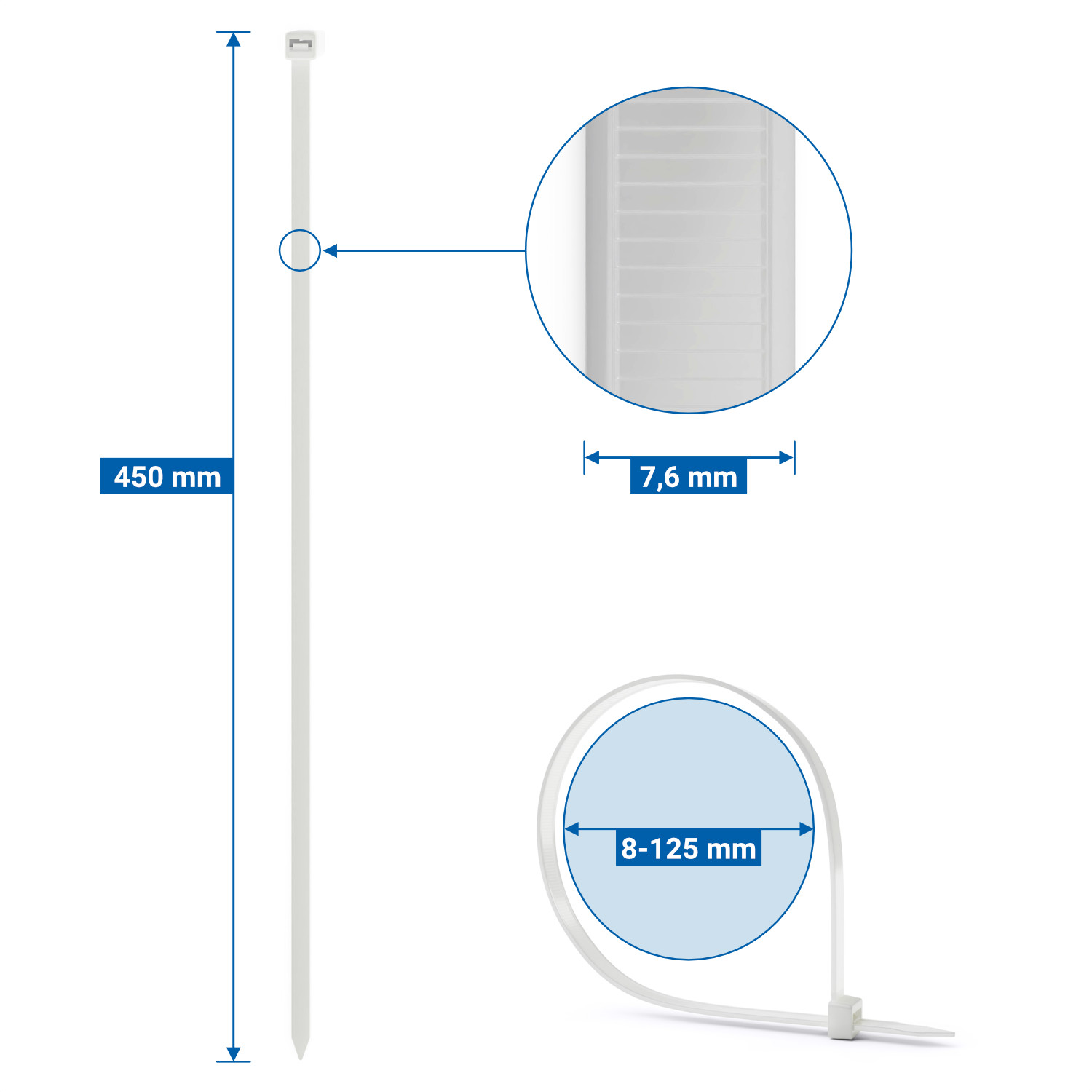 deleyCON 50x Kabelbinder 450mm x 7,6mm Sehr hohe Zugkraft Reißfestigkeit Weiß