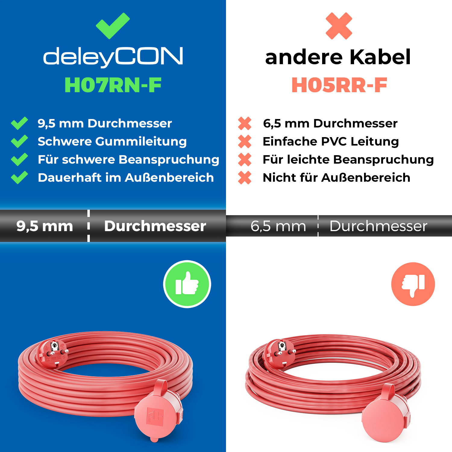 - Das deleyCON Outdoor Verlängerungskabel (H07RN-F 3G1.5mm²) ist bestens für den Einsatz im Garten, in Feuchträumen und sogar in industriellen Umgebungen geeignet, dank seiner Vielseitigkeit und Robustheit
