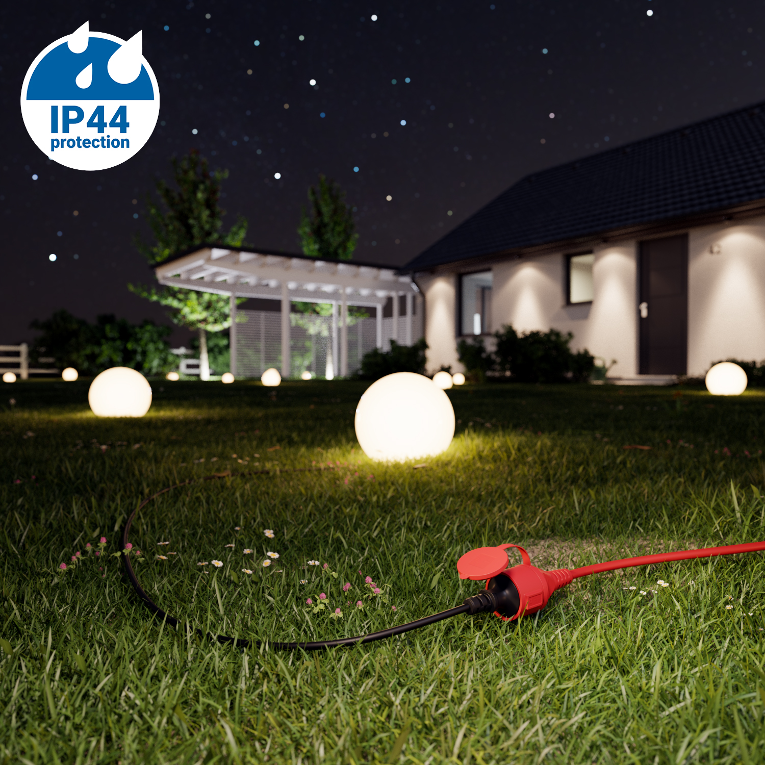 - Schutzart IP44: Mit der Schutzart IP44 ist dieses Kabel spritzwasserbeständig und somit ideal für den Einsatz im Garten, am Gartenteich oder sogar auf Baustellen geeignet