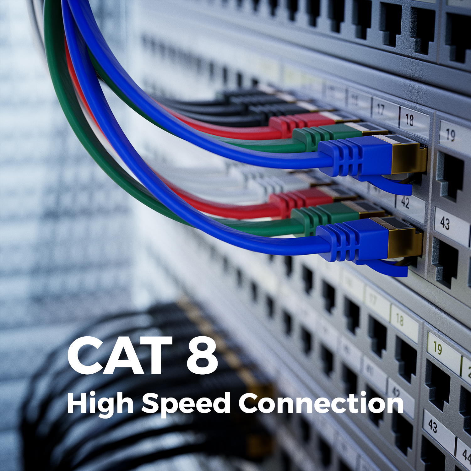 Ob im Heimnetzwerk, Büro oder Rechenzentrum – das flache CAT8-Kabel verbindet Router, Switch und Patchpanel auf minimalem Raum.