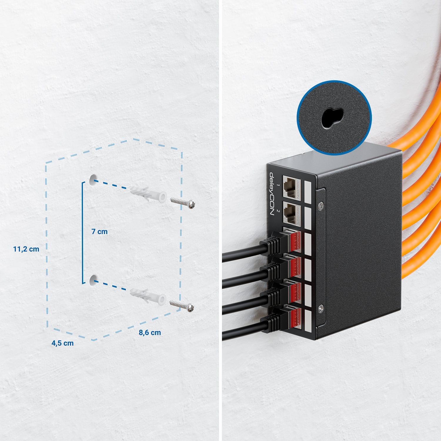 - Auf der Rückseite befinden sich zwei Löcher, die eine perfekte Wandmontage ermöglichen