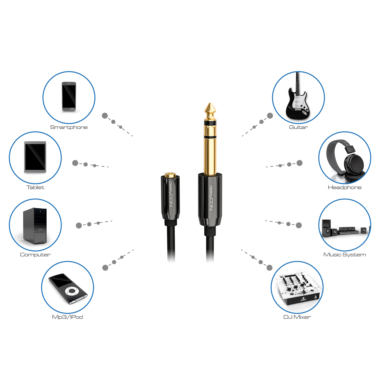 deleyCON Audio Klinken Adapter Kabel sind gemäß heutigen Standards in der Lage, ein störungsfreies, erstklassiges Tonerlebnis zu liefern. Der passgenaue, vergoldete 6,3mm Klinken Stecker und die 3,5mm Klinken Buchse sind aus besonders leitfähigem Metall, tragen so zu einer überragenden, verlustfreien Tonqualität bei.