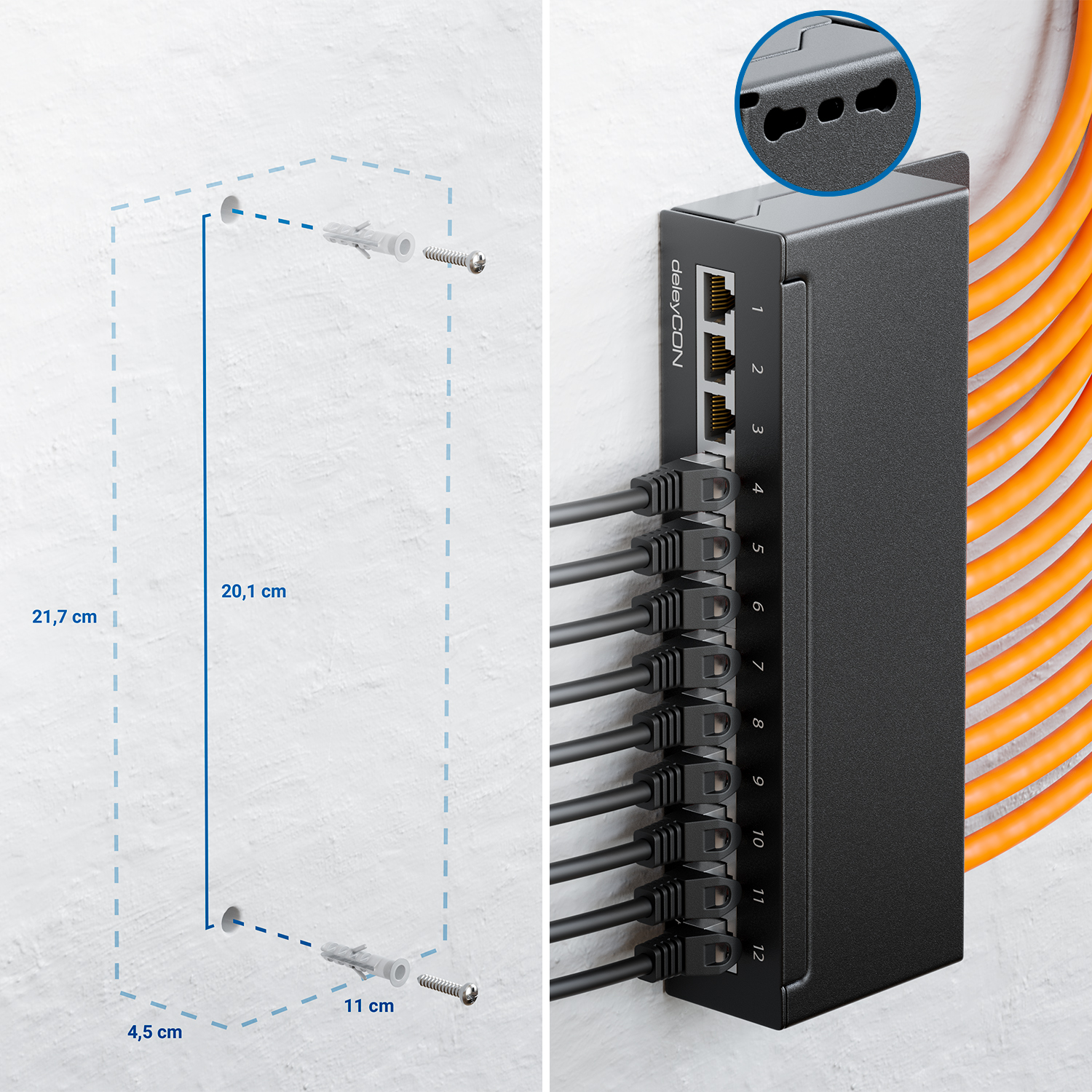 Das Patchpanel besitzt an der Vorderseite 12x RJ45 Netzwerkbuchsen, über diese können Sie schnell und einfach eine Vielzahl von Endgeräten per Netzwerkkabel anschließen. An der Rückseite des Patchpanels können Sie unkompliziert Netzwerk Verlegekabel über LSA+ anschließen. Das deleyCON CAT6a Patchpanel ist selbstverständlich zu allen gängigen Netzwerkkabel-Normen kompatibel. (z.B. CAT5e, CAT6, CAT6a, CAT7)