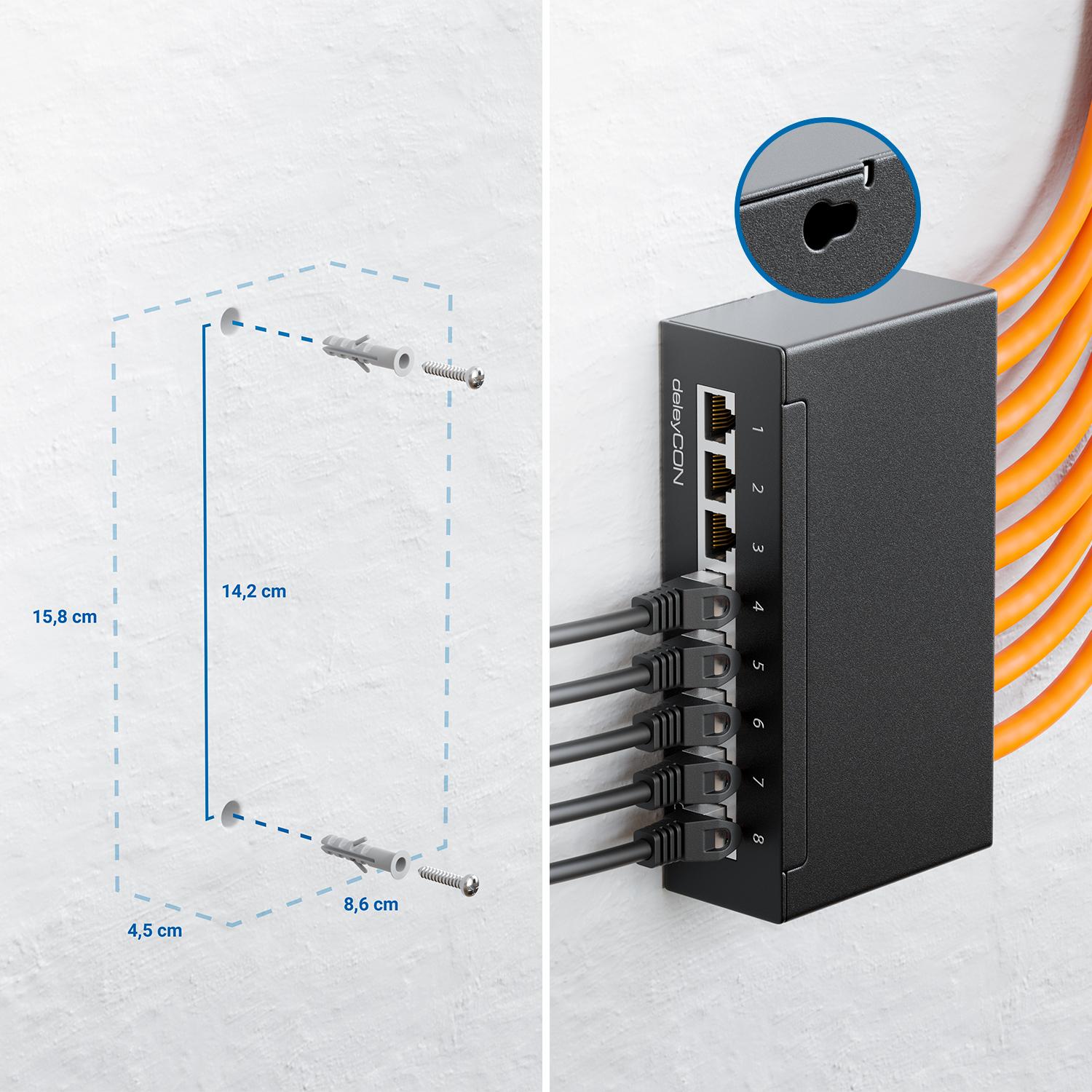 deleyCON CAT6a Patchpanel 8 Port Desktop Wandmontage Geschirmt 8x RJ45 Schwarz