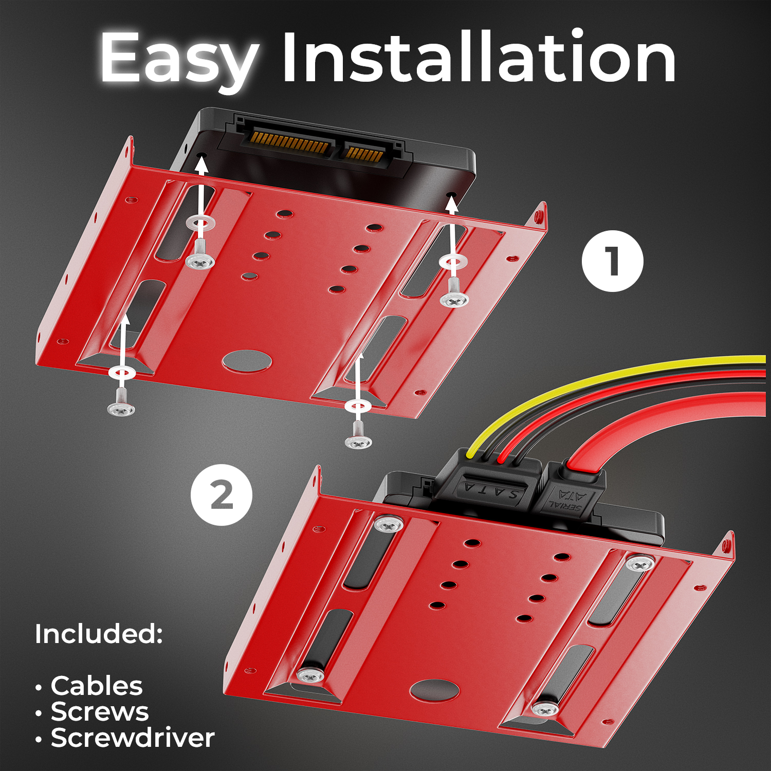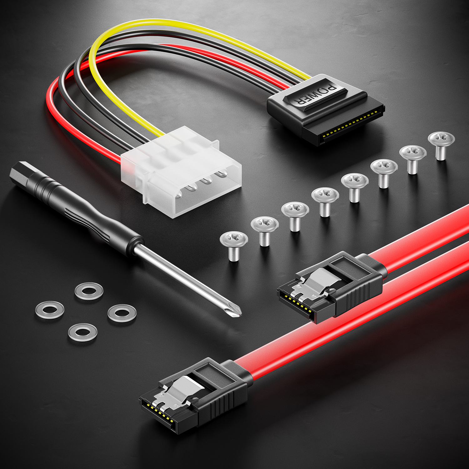 Das Set enthält alle notwendigen Schrauben, ein SATA-Kabel und einen Schraubendreher, um eine schnelle und einfache Montage zu gewährleisten.