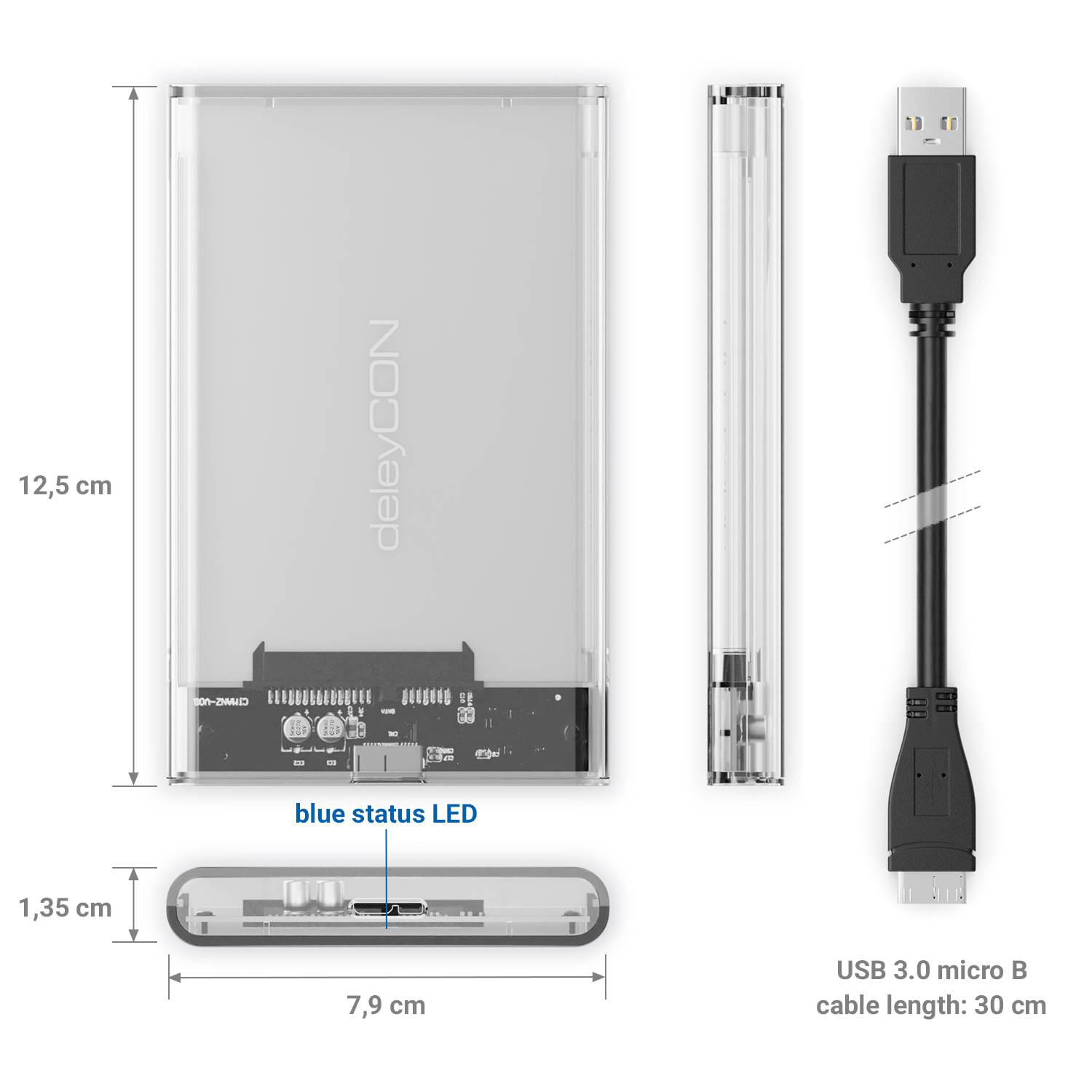 deleyCON Festplattengehäuse 2,5“ SATA3 HDD SSD 7mm 9,5mm Micro-USB Transparent